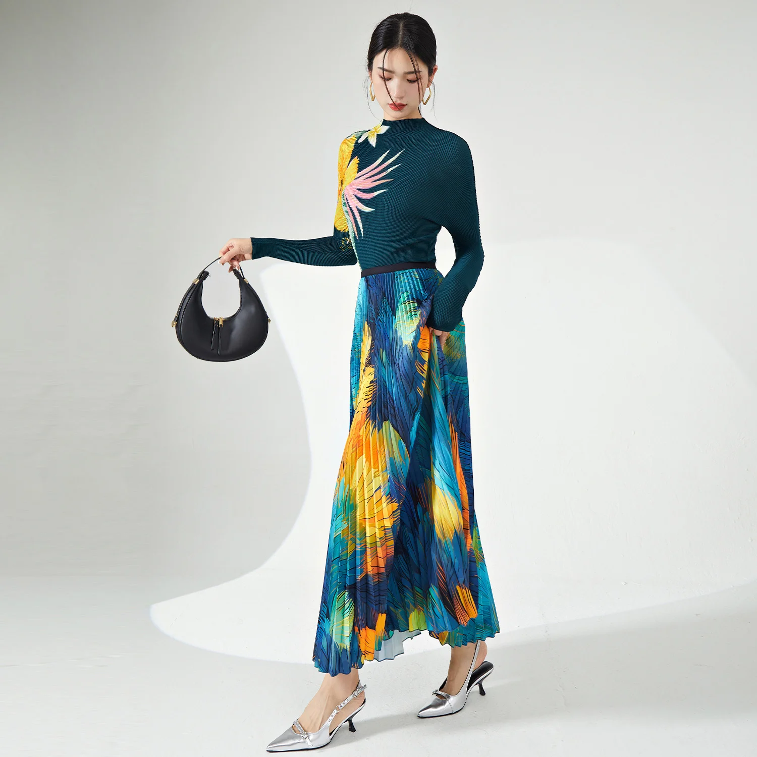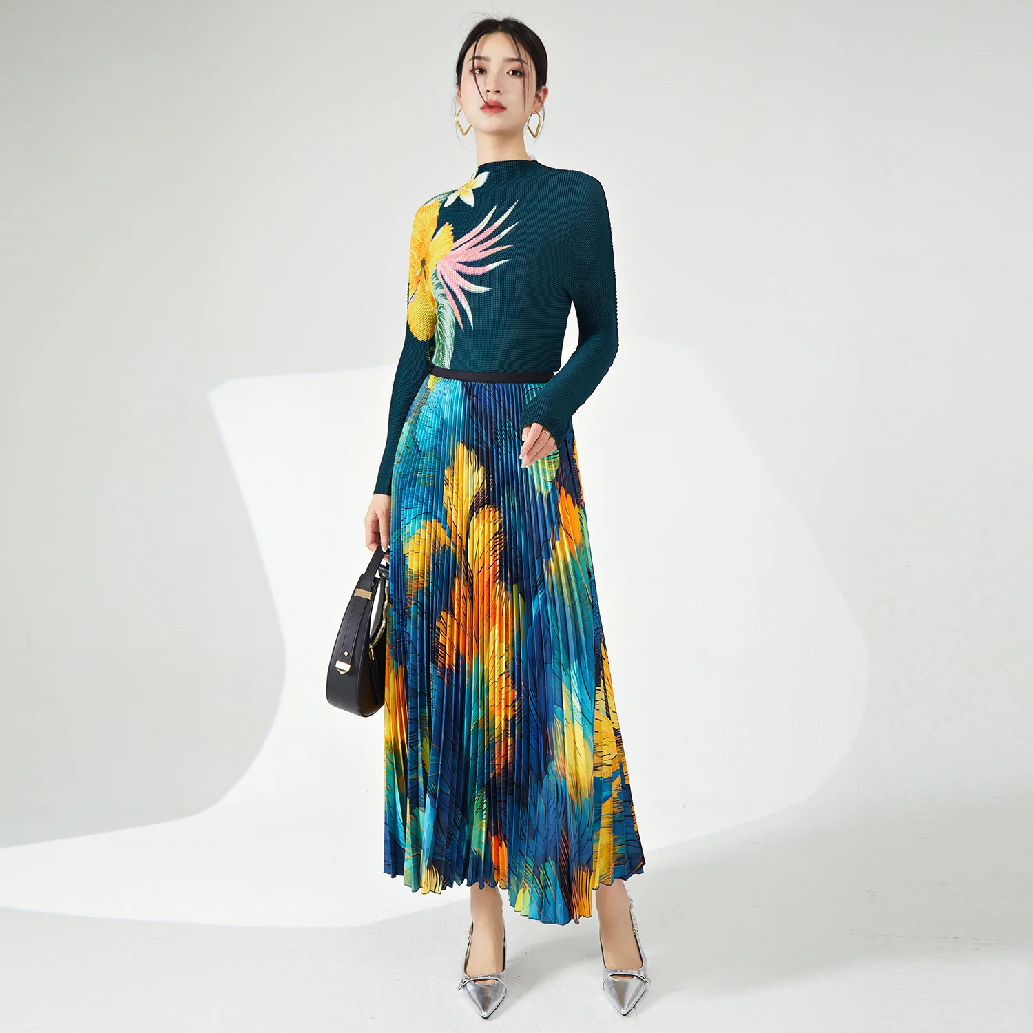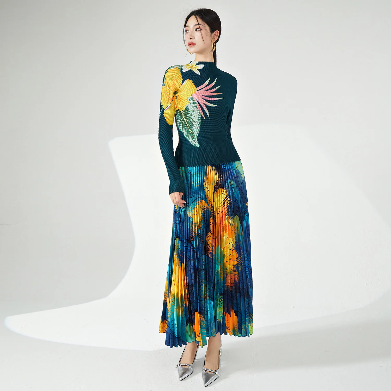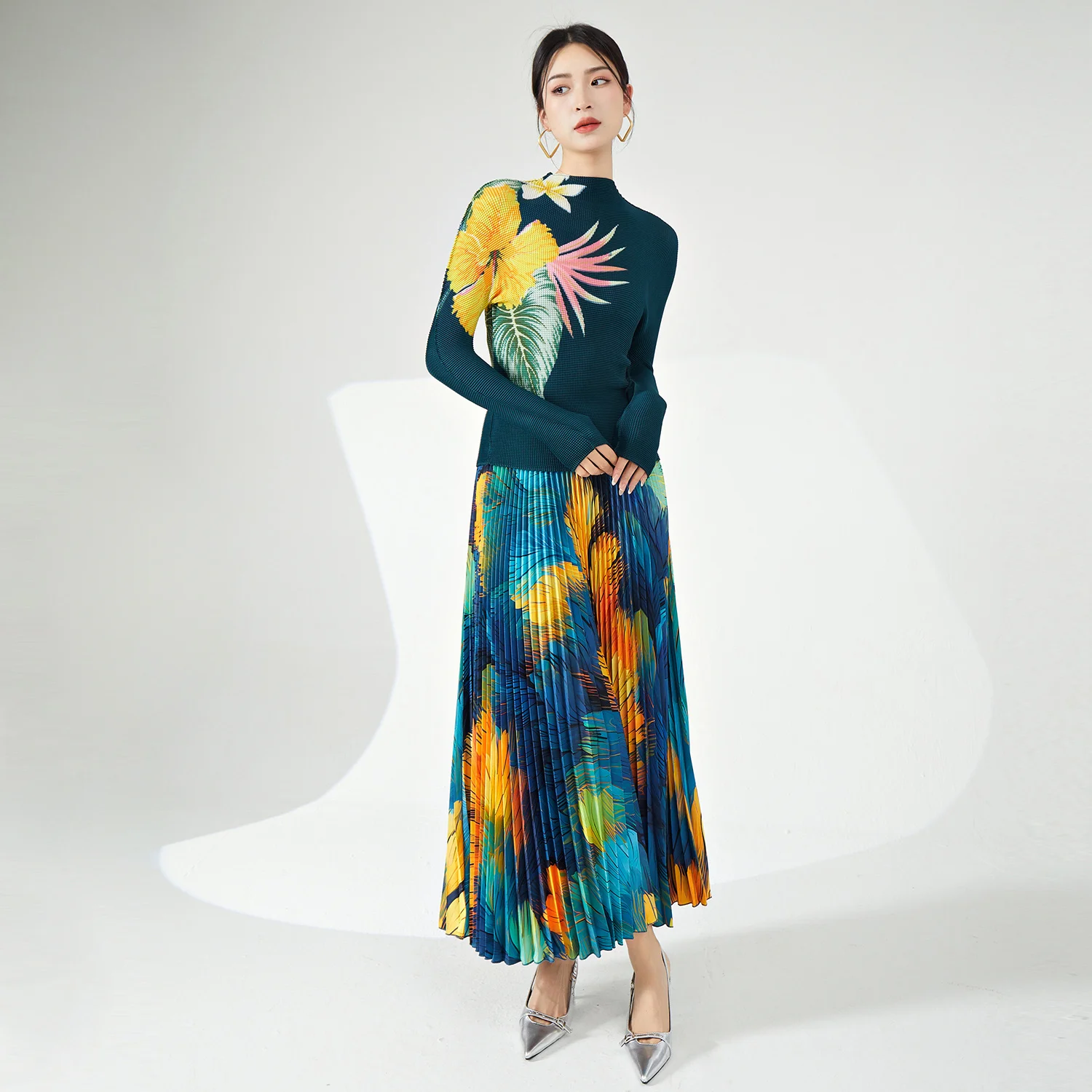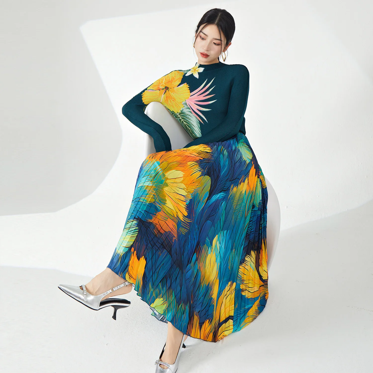 High Quality Pleated Stretch Top and Long Ankle Skirt Personalized Printed Two-Piece Set for Women Plus Size Casual Clothing