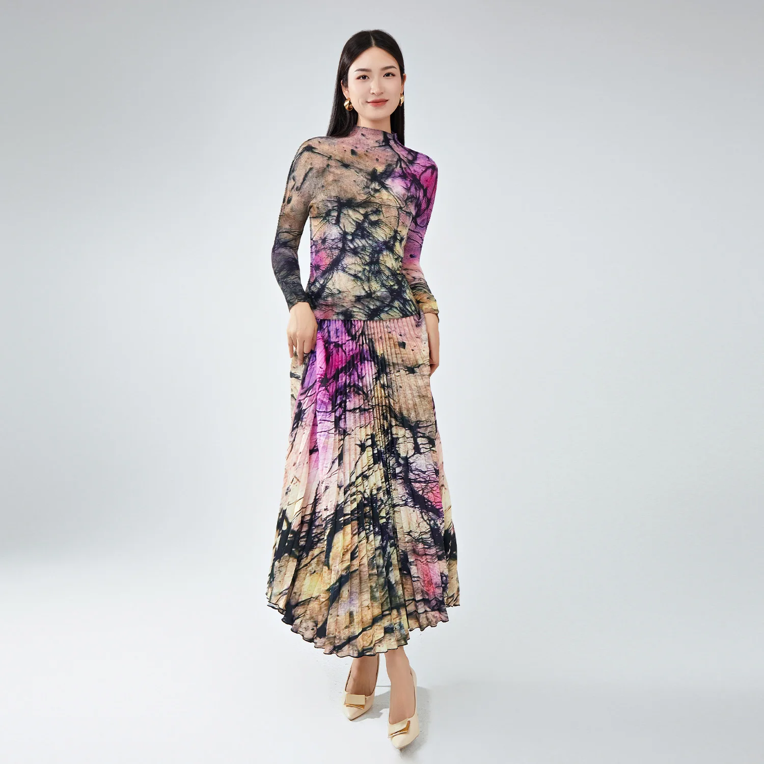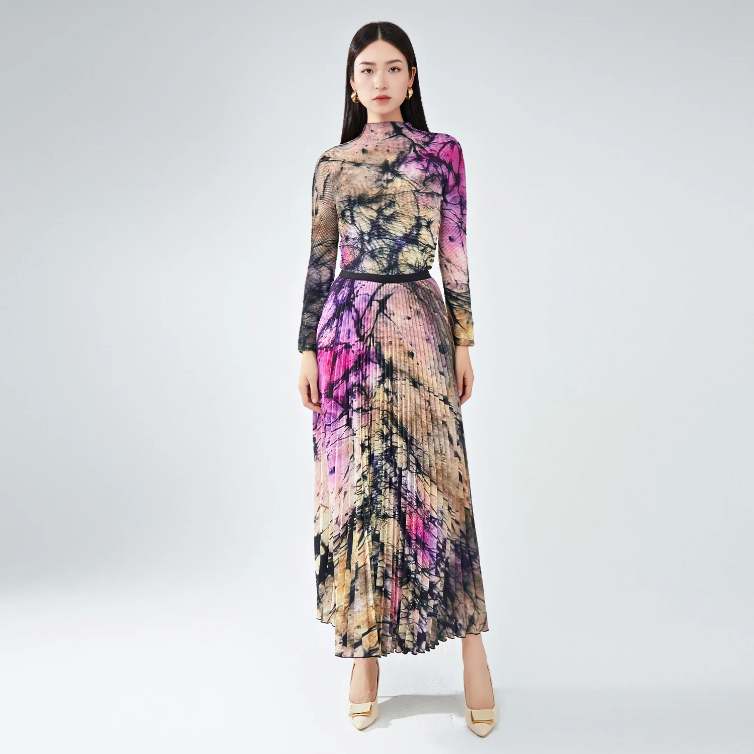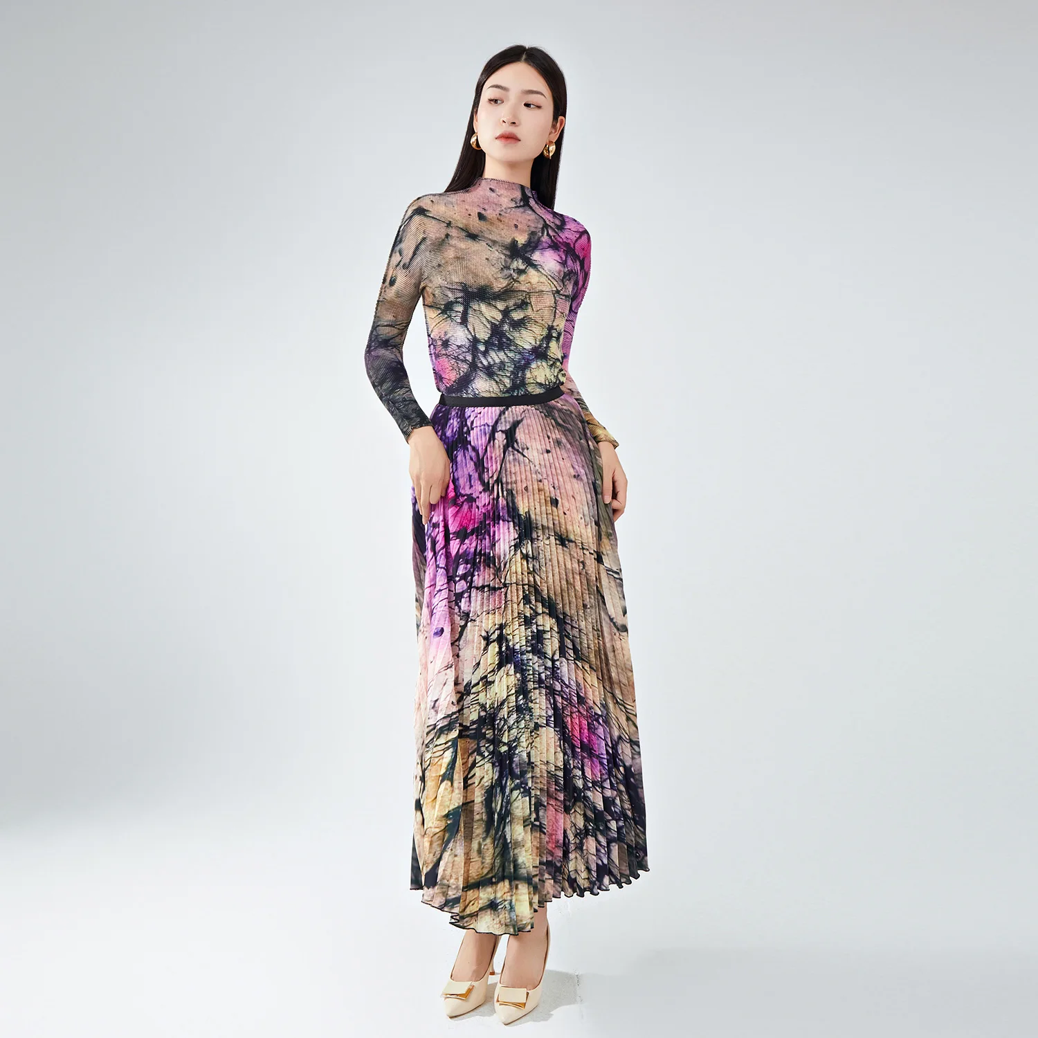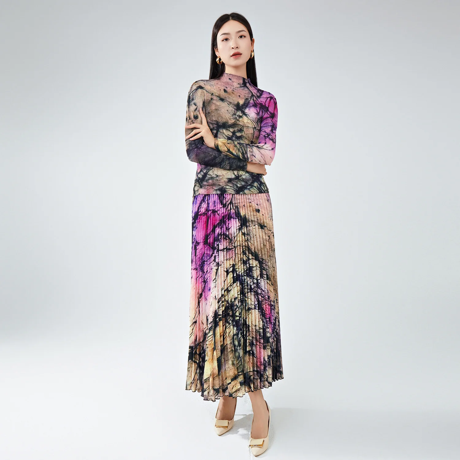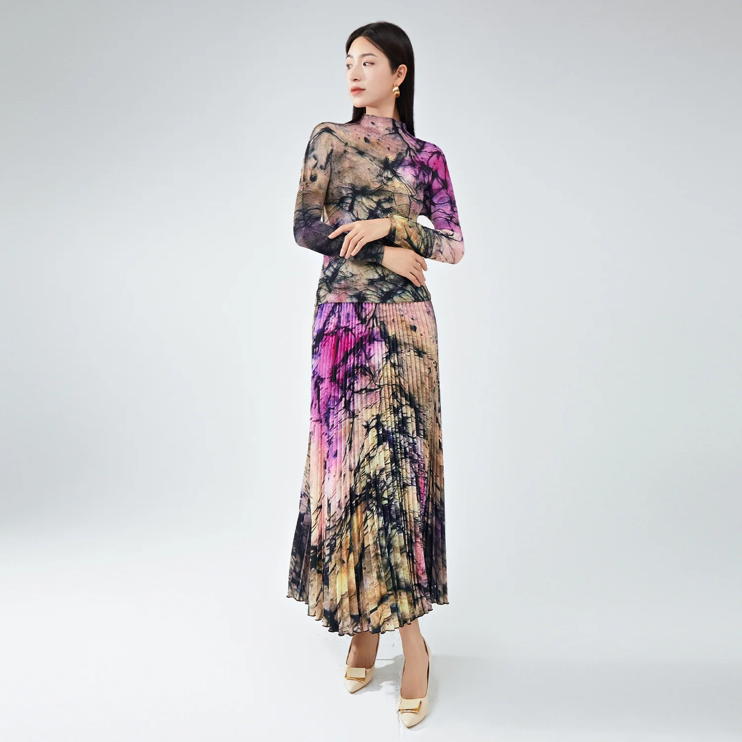 Women's Casual Two-Piece Set Fashionable Elastic Printed Long-Sleeved Turtleneck Top Pleated Ankle-Length Woven Summer