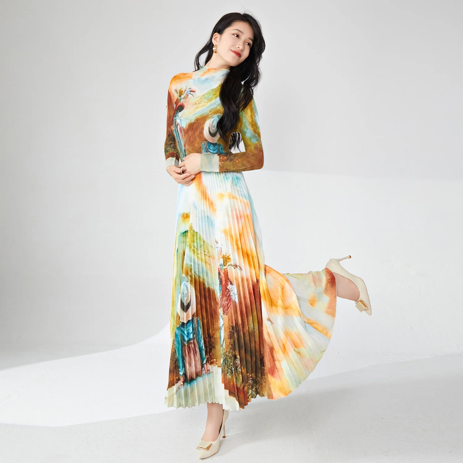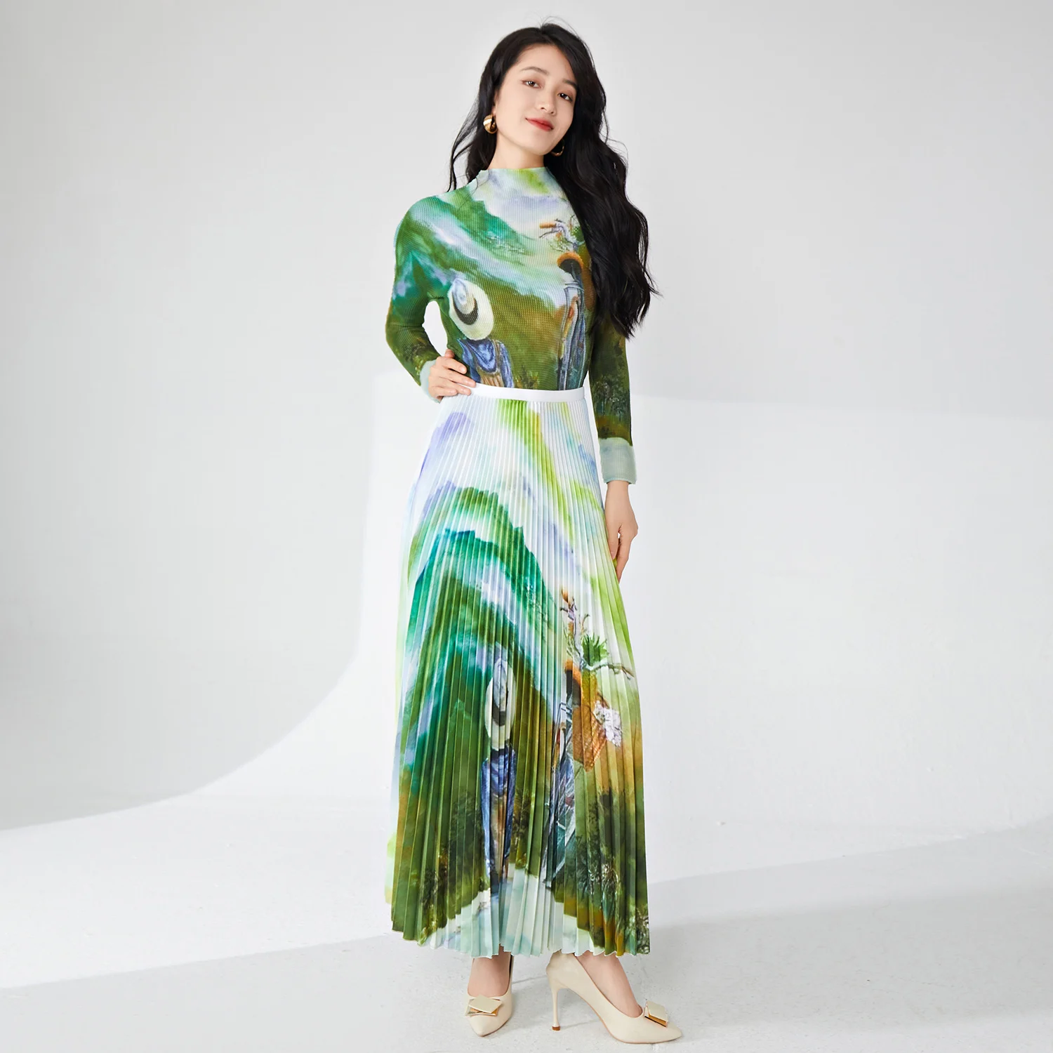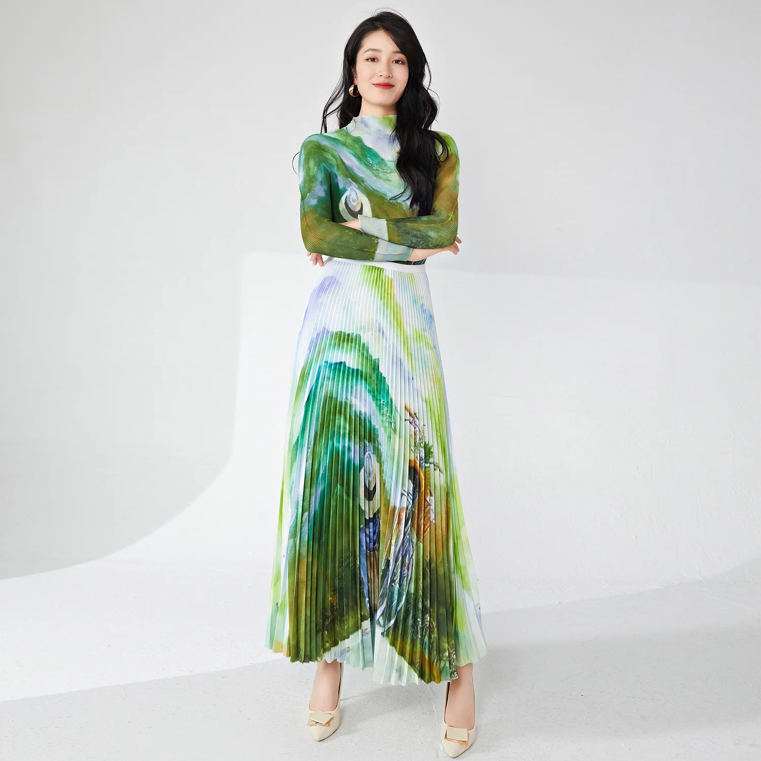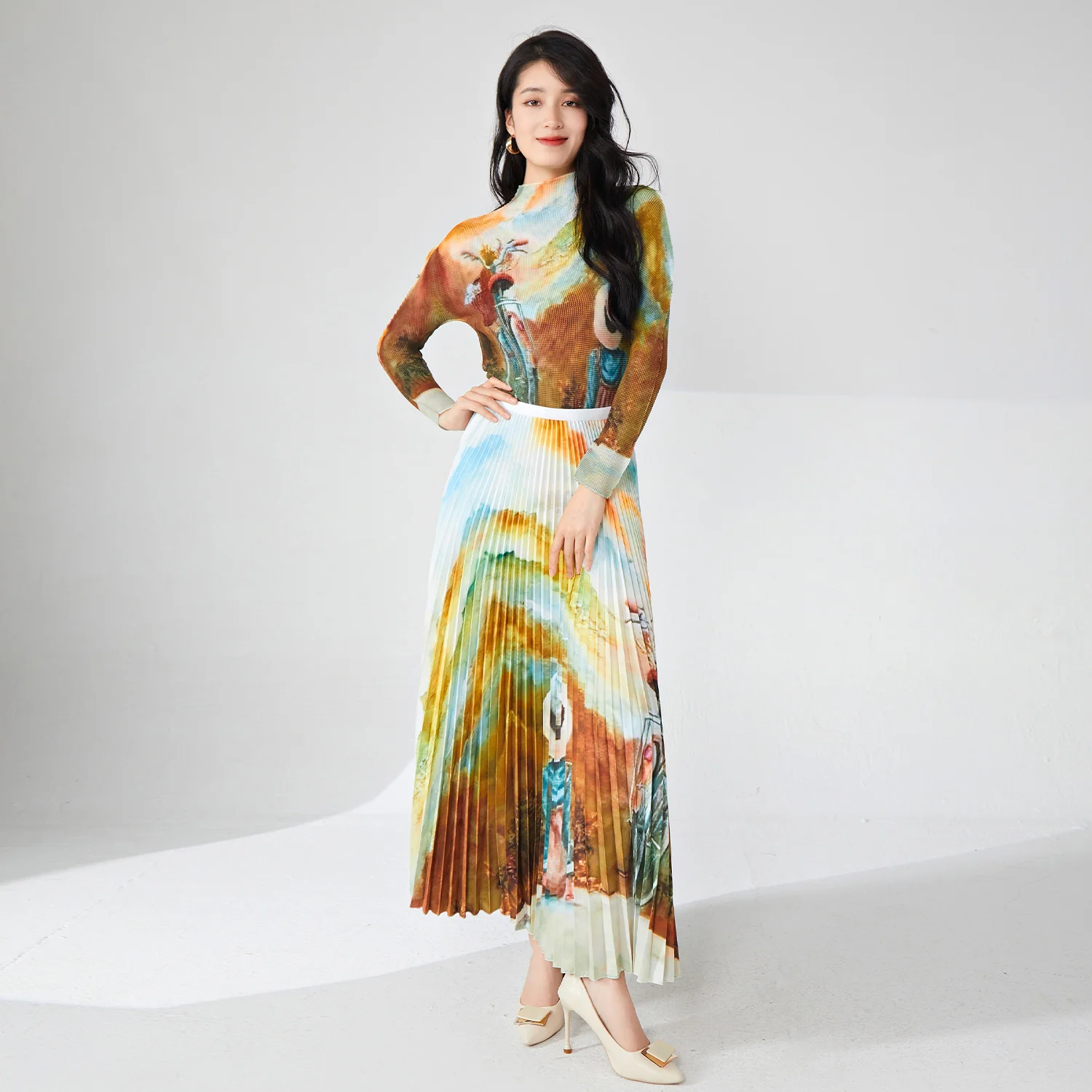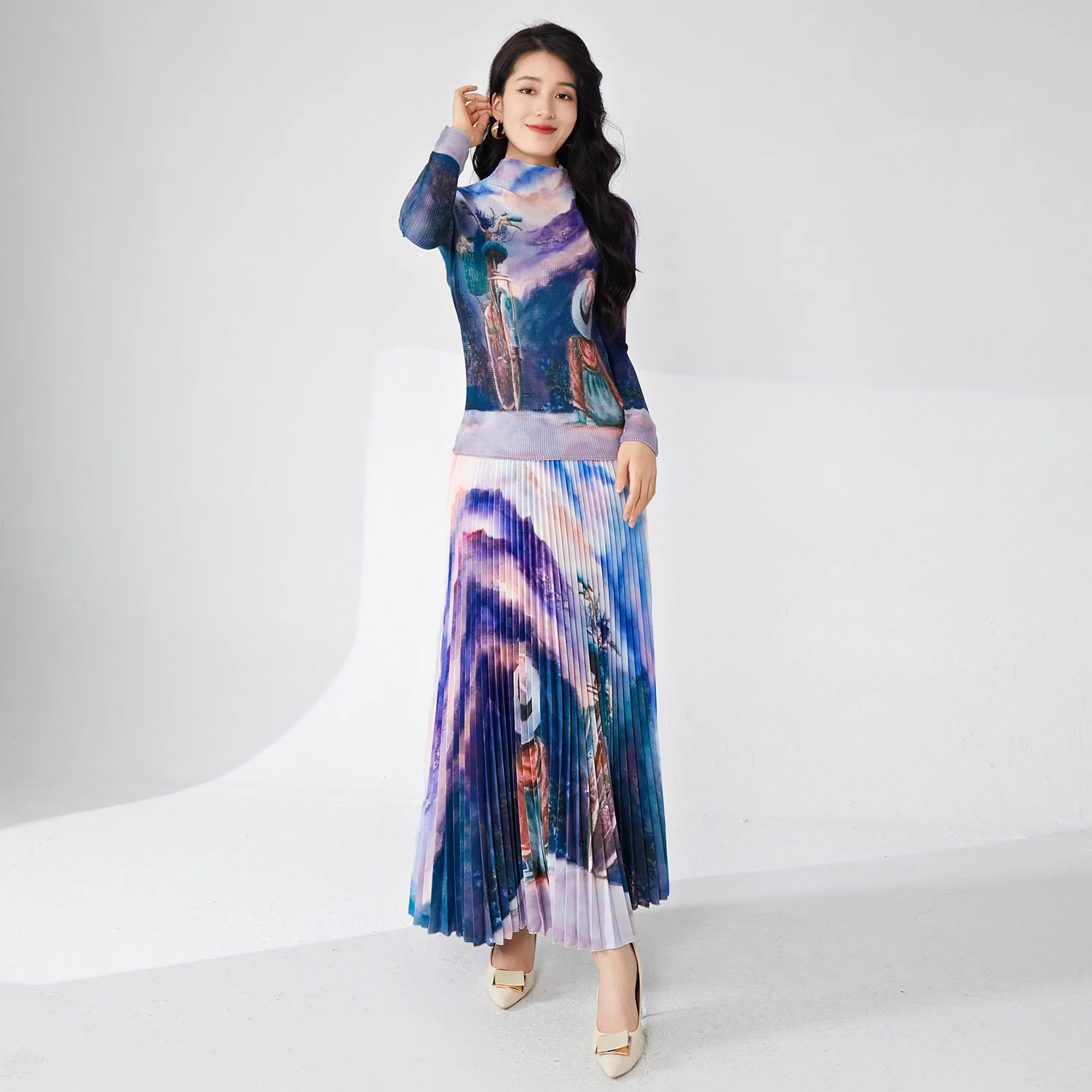 Miyake Women's Elegant Stretch Printed Turtleneck Top and A-Line Skirt Set Floral Two-Piece Fashion for Summer Casual Style