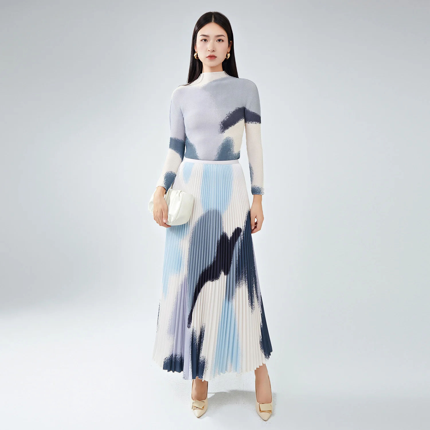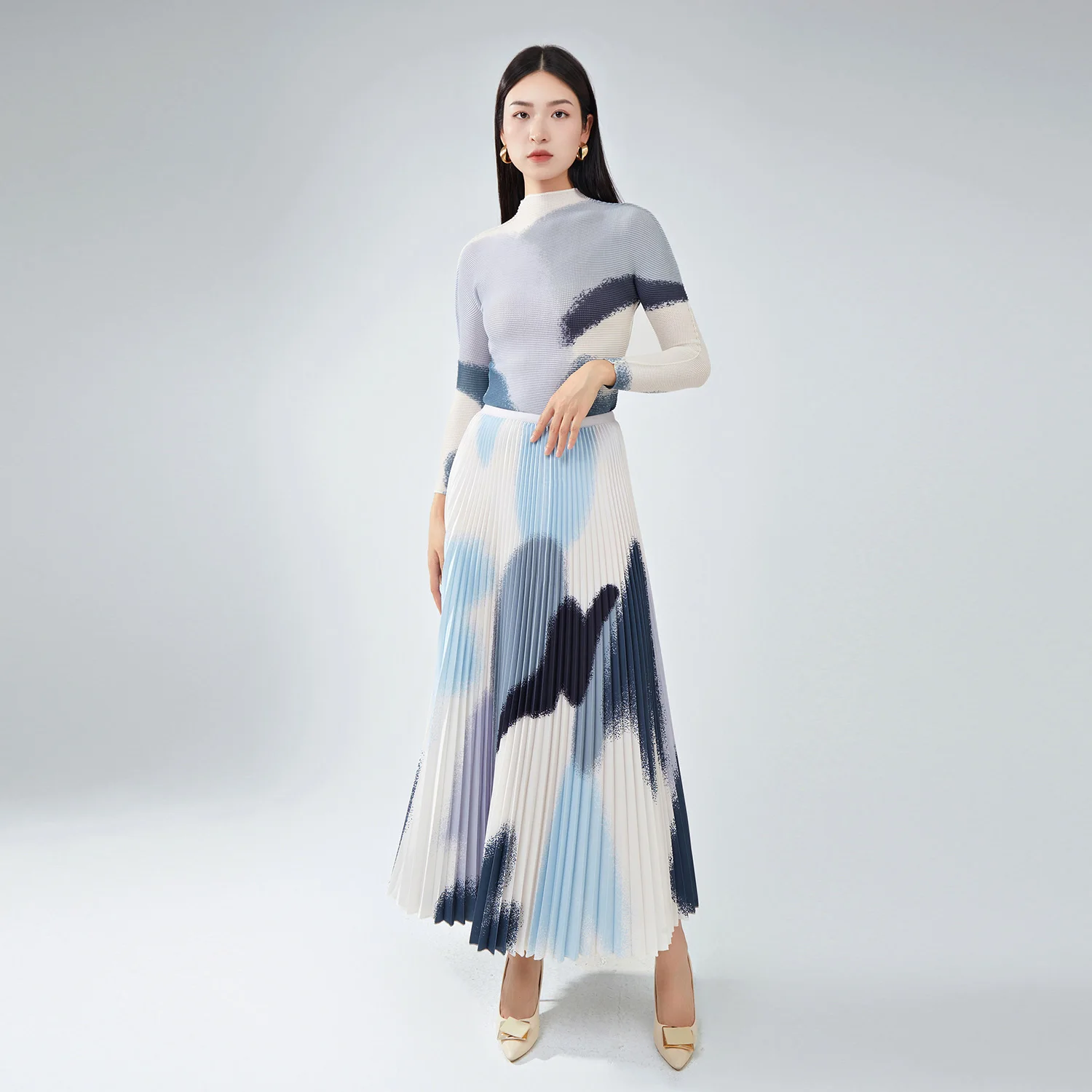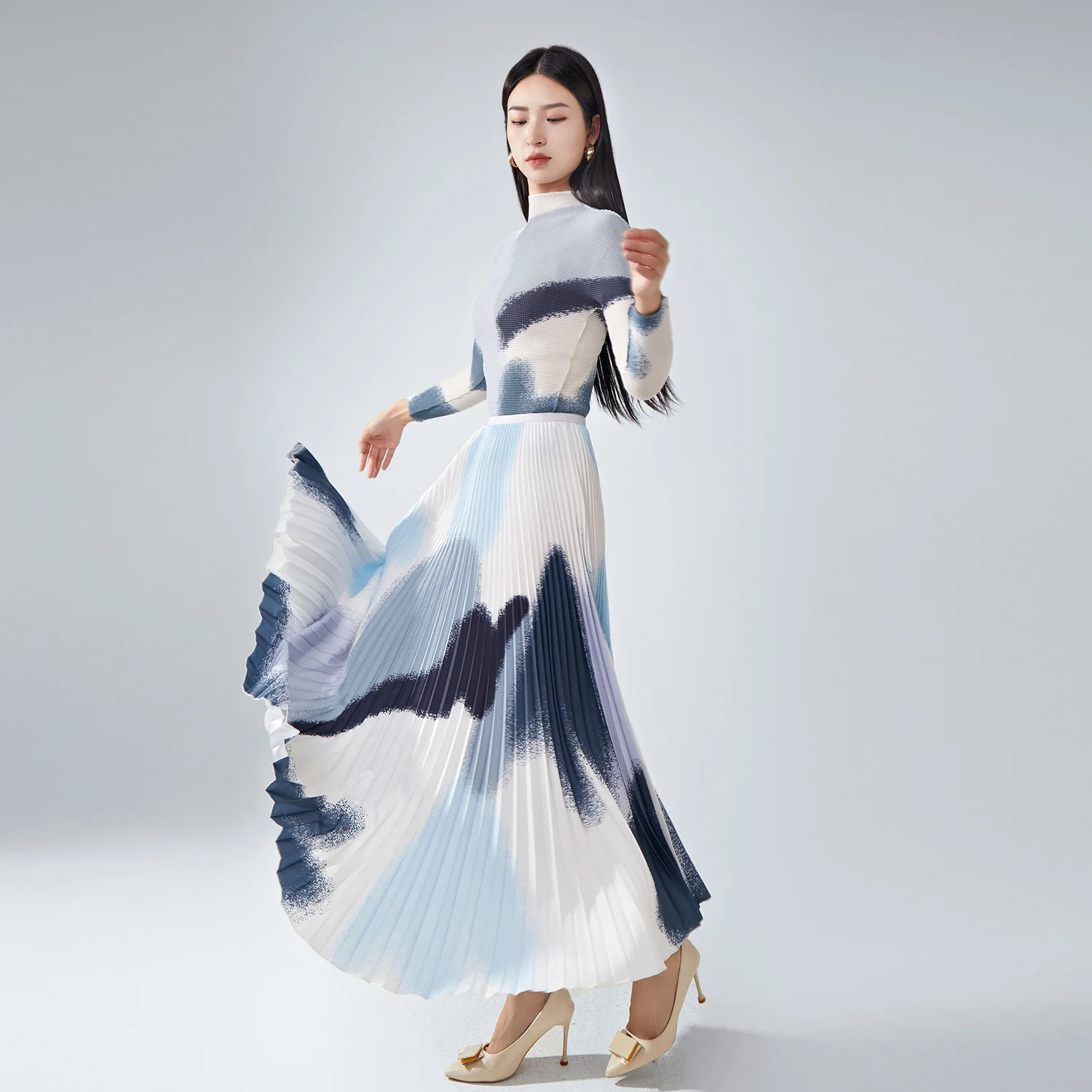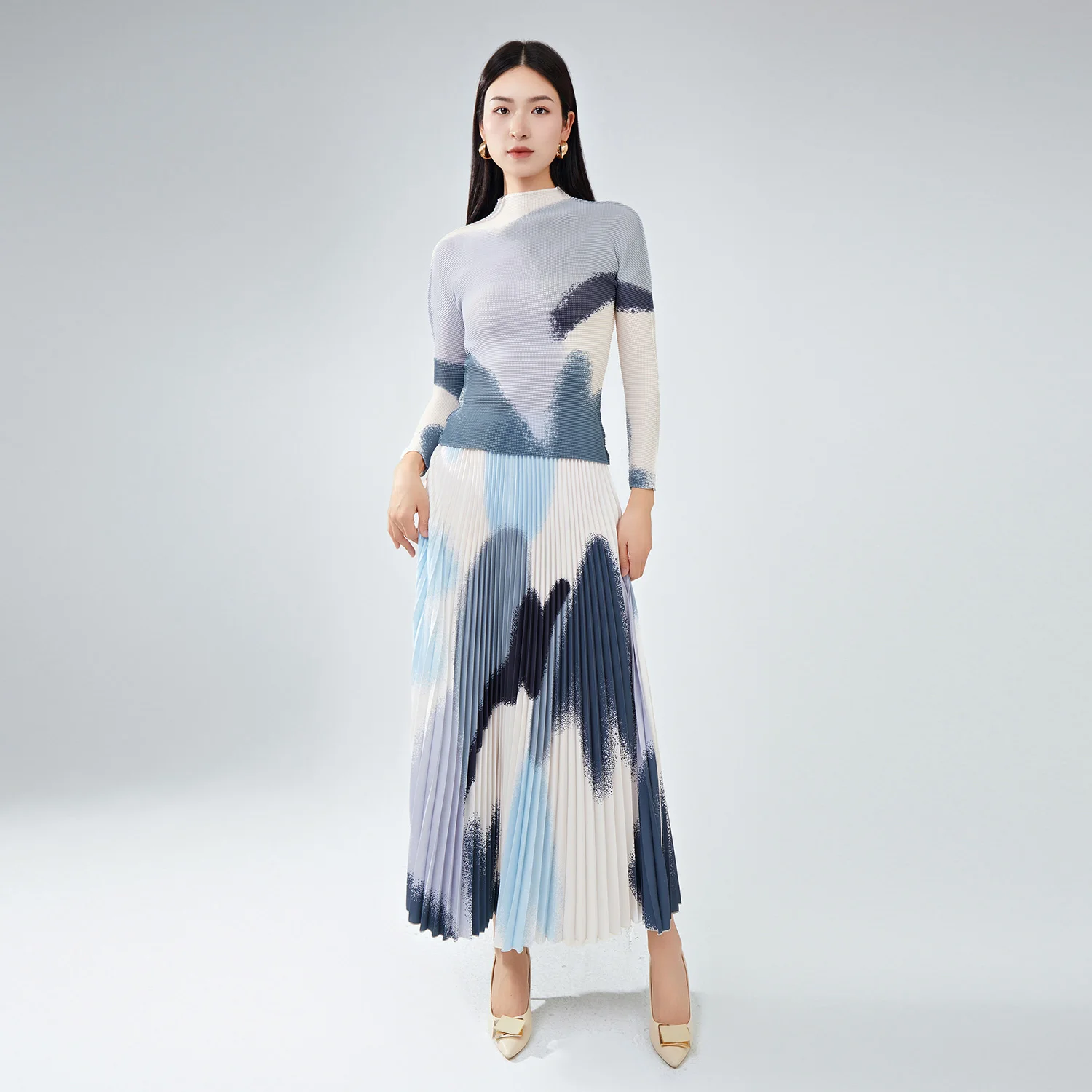 High Quality Women's Fashionable Printed Pleated Long-Sleeved Top and Full Skirt Two-Piece Set