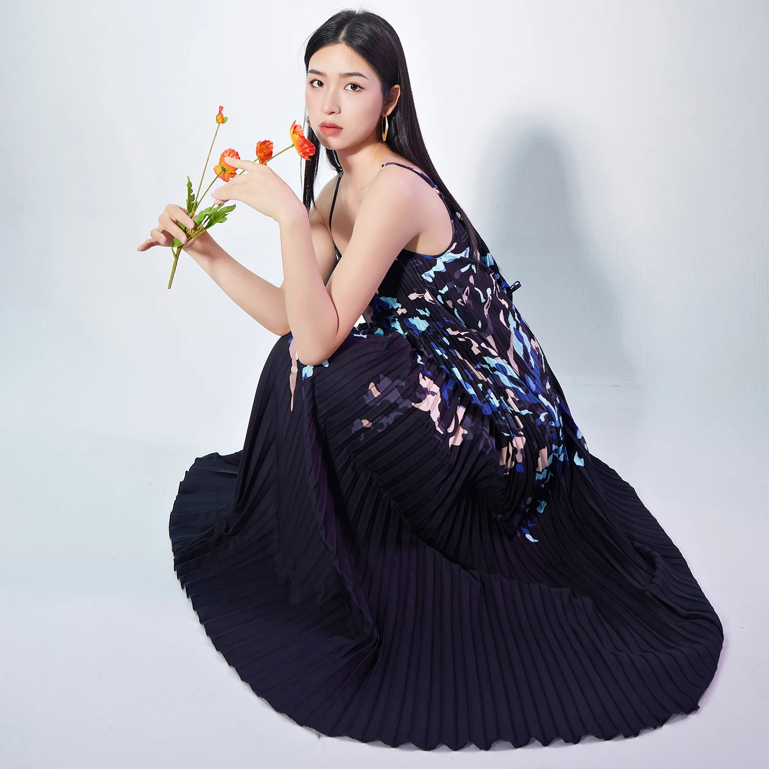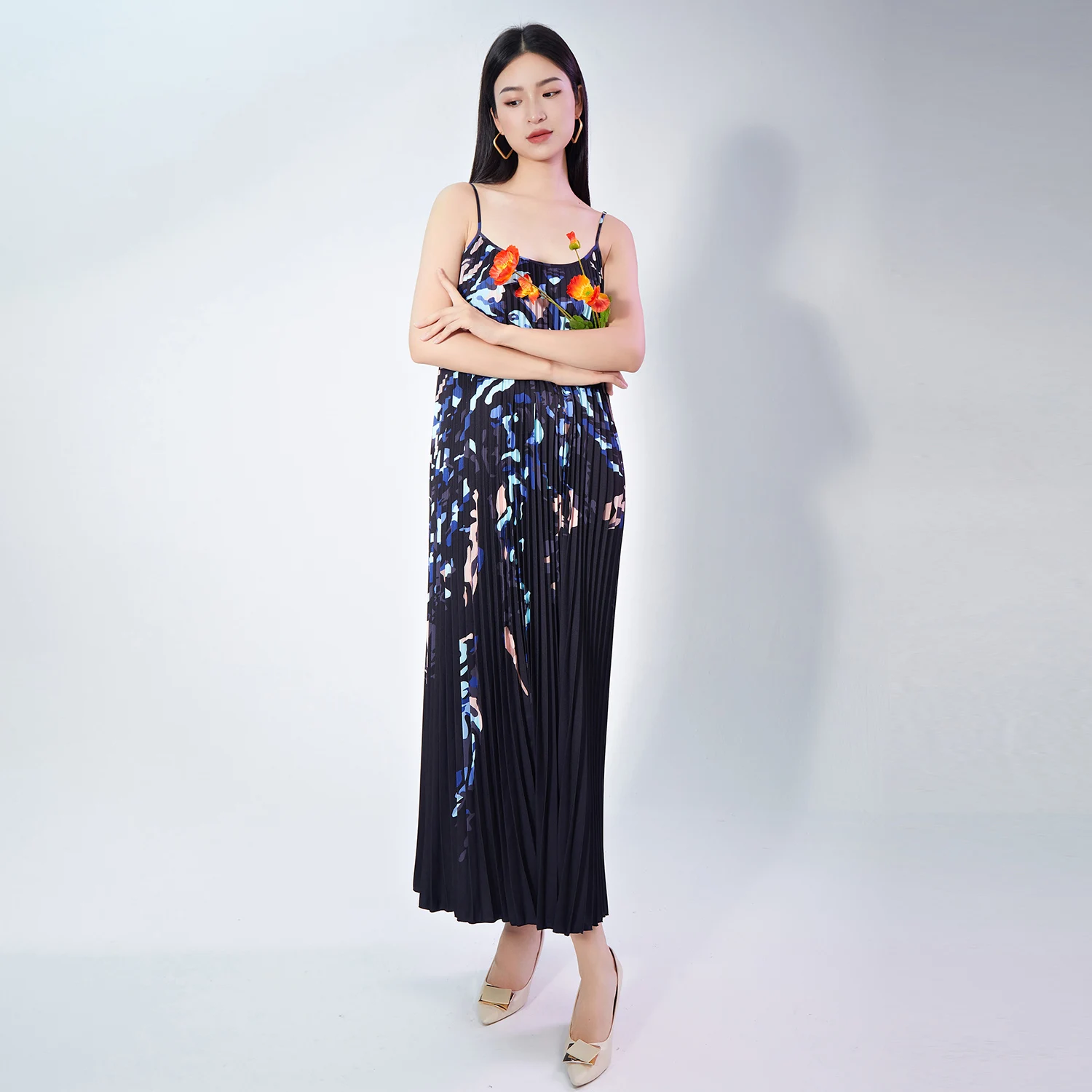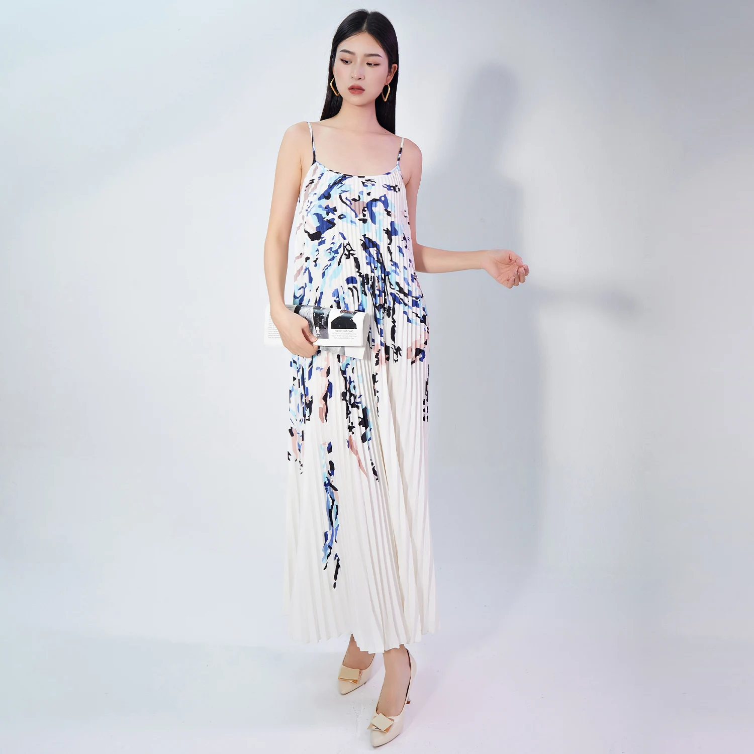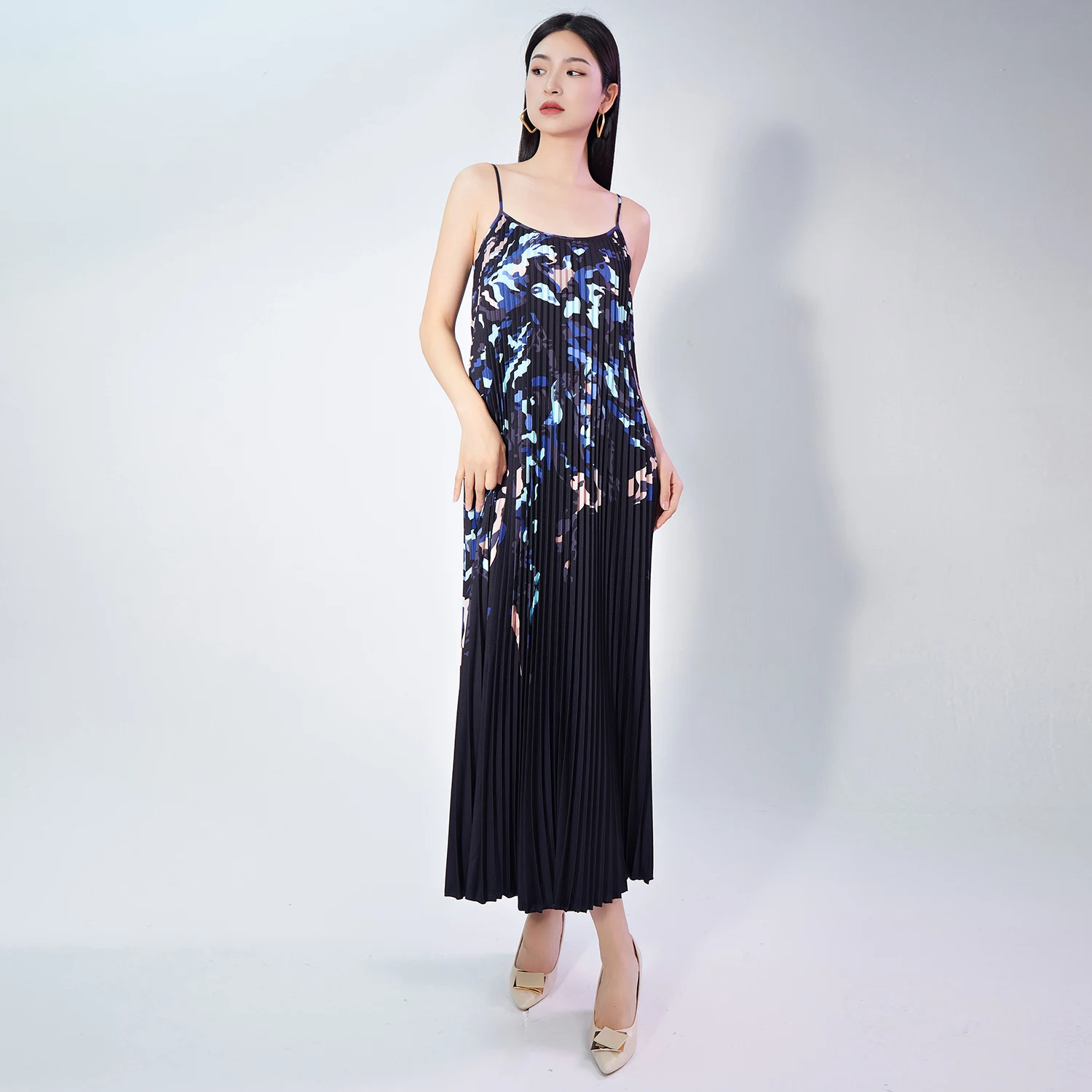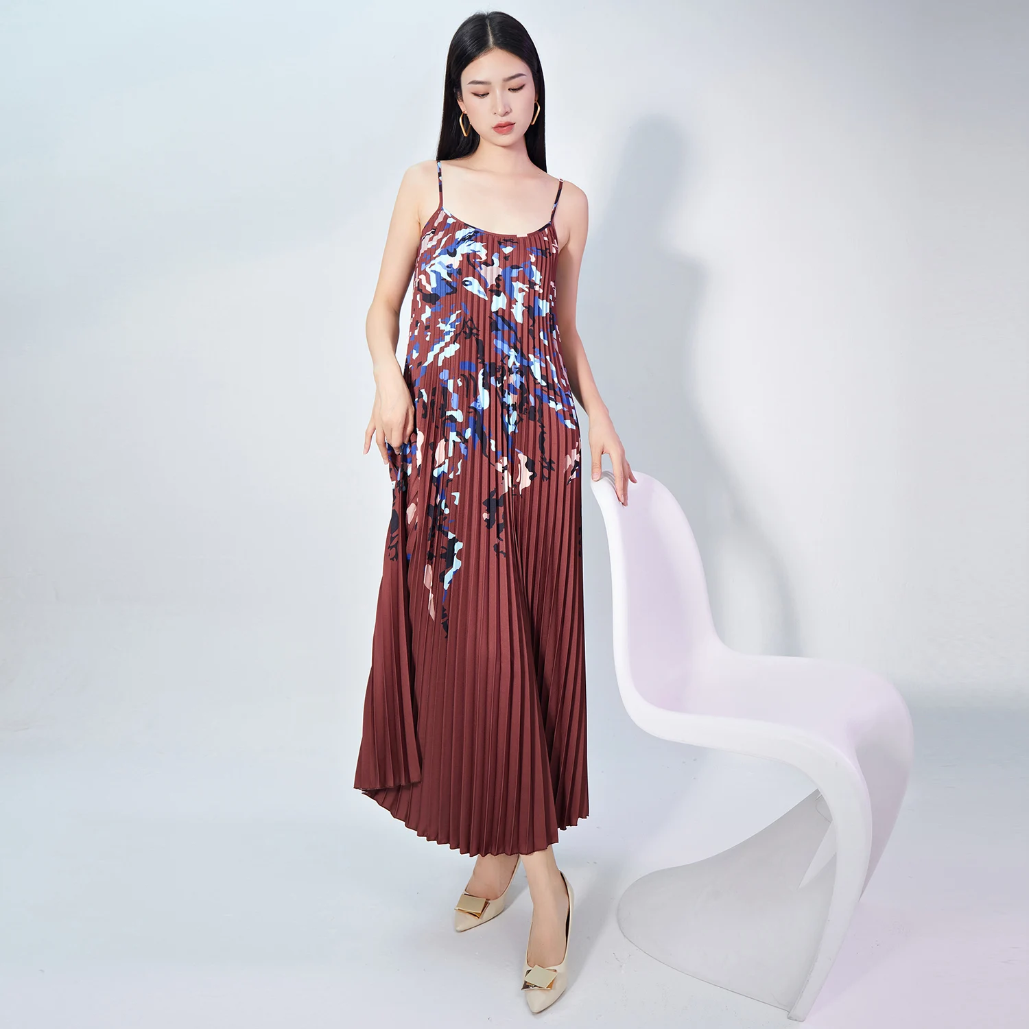 New Fashion Summer Elegant Printed Pleated Slip Dress Low Cut Loose High Waist Midi Ladies Casual Dresses