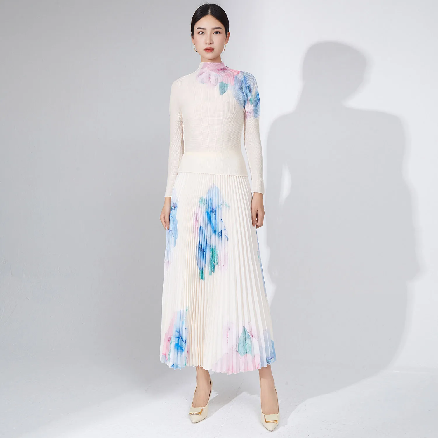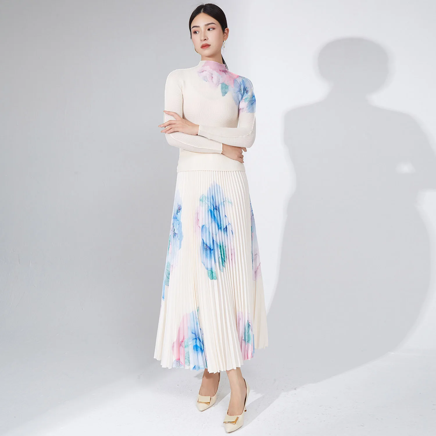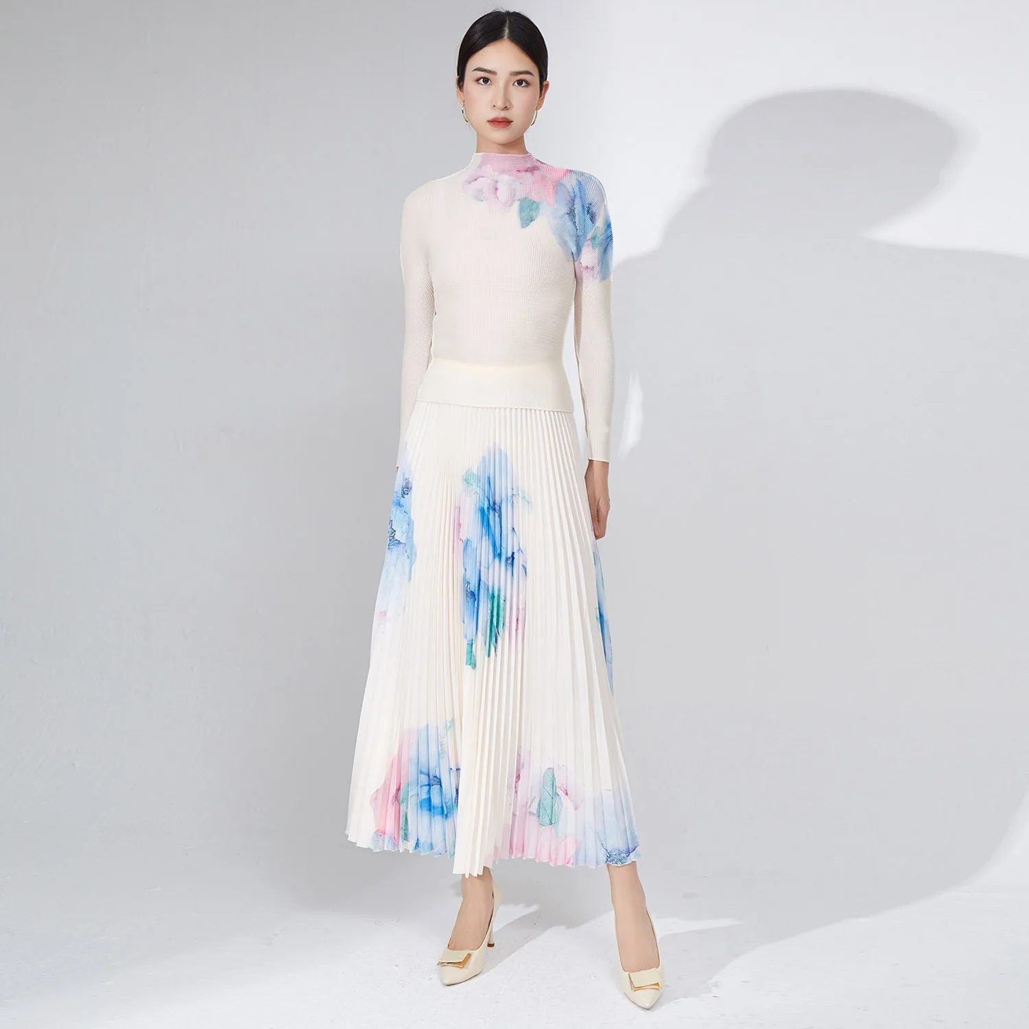 Fashionable Pleated Elastic Shirt and Skirt 2-Piece Set Printed Swing Skirt and Casual Top