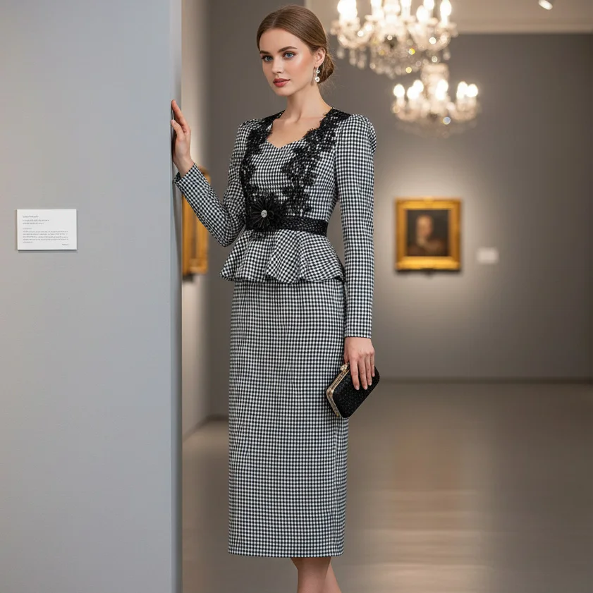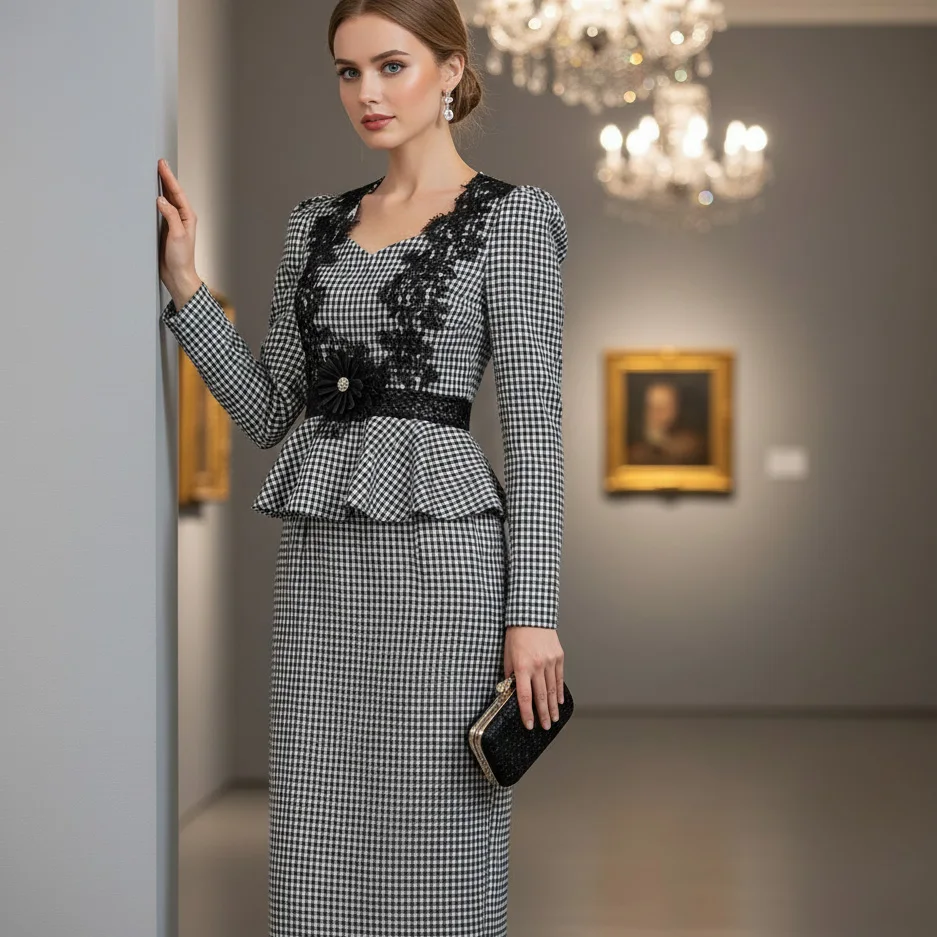 ZYHT 21950 Women's Elegant Black & White Houndstooth Dress Long Sleeve Ladies Dress with Lace Embroidery Midi Sheath Dress