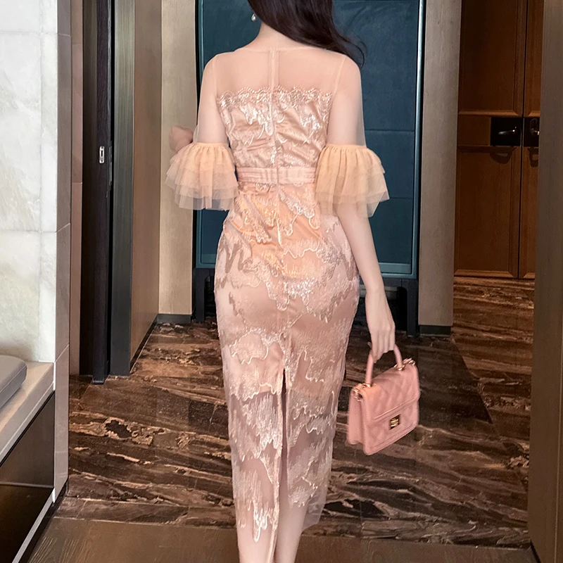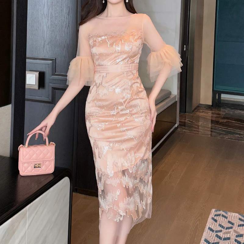 ZYHT 21383 Birthday Party Sexy Dress Half Lantern Sleeve Pencil Embroidery Lace Lady New Cocktail Elegant Midi Dress for Women