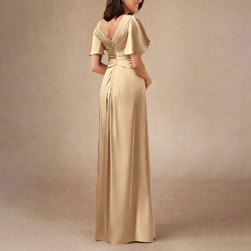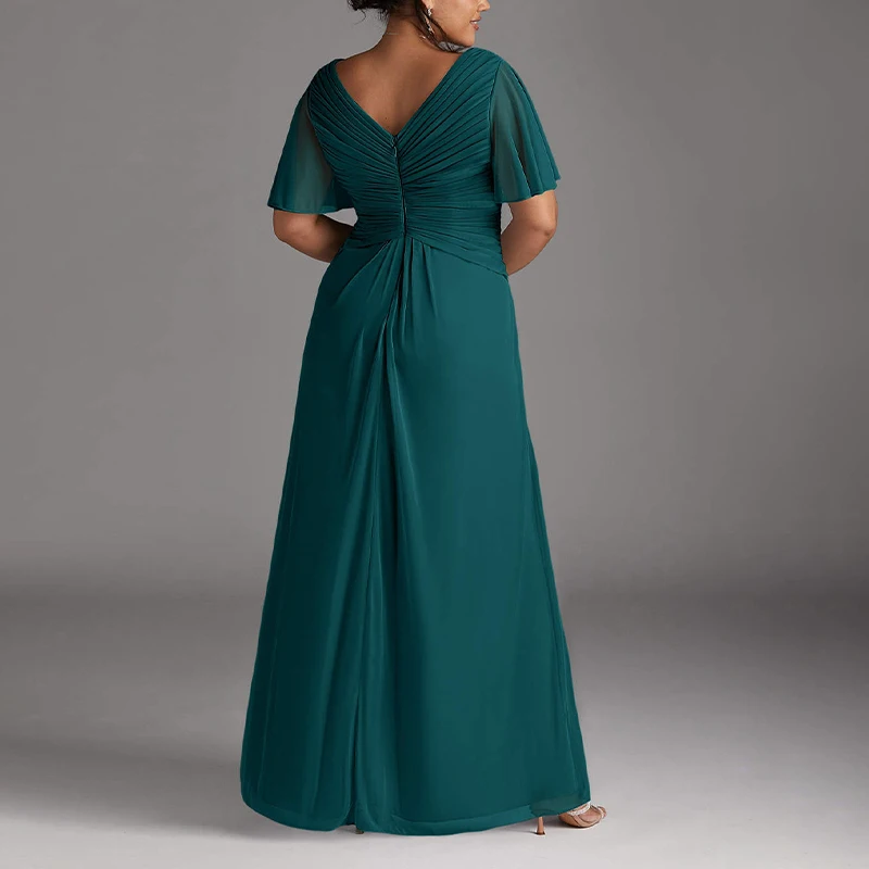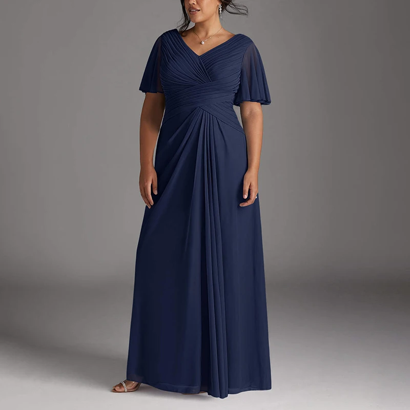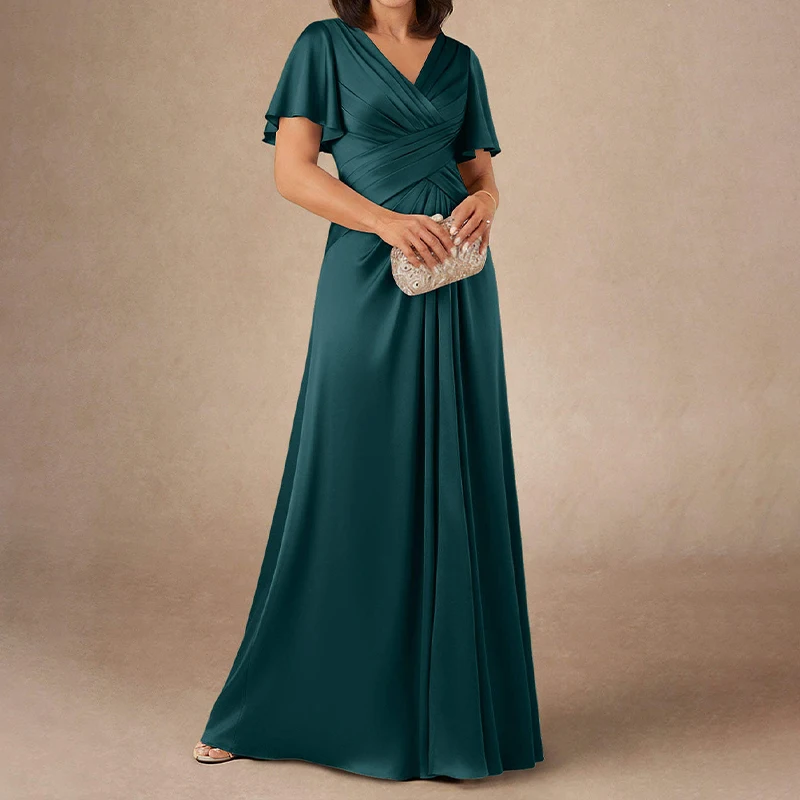 ZYHT 73989 China Factory Customize Color Fabric Designs Burgundy Gold Dark Green A-Line V-Neck Pleated Mesh Dress