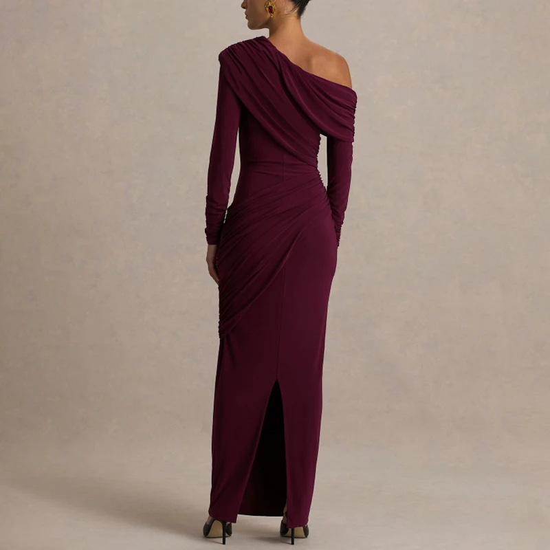 ZYHT 74119 Factory Manufacturer Women Pleated One Shoulder Stretch Long Sleeve Maxi Burgundy Elegant Chic Evening Cocktail Dress