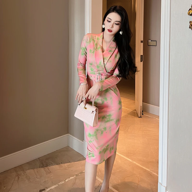 ZYHT 20186 Spring New Elegant Women Clothes V Neck Floral Print Long Sleeve Belted Midi Work Ladies Office Career Dresses