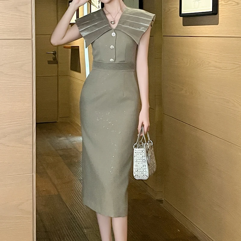 ZYHT 30911 New Arrival Women's Elegant Ruffled Sleeveless Slim Rhinestones Formal Ladies Pencil Business Work Dresses for Office