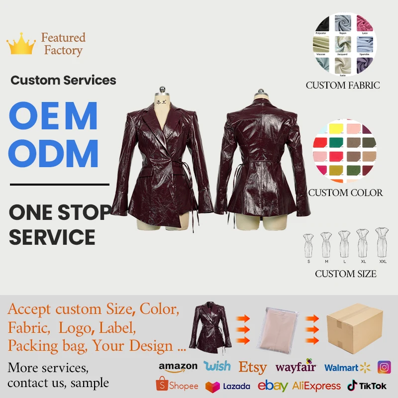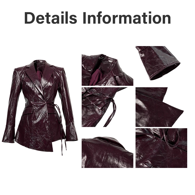 ZYHT 35234 Women Autumn Winter Formal Burgundy Solid Faux Leather Blazer V-Neck Lace up Fit Asymmetrical Jacket Coat