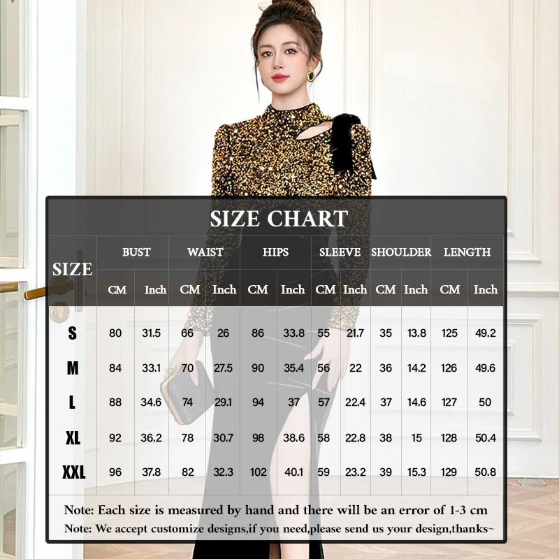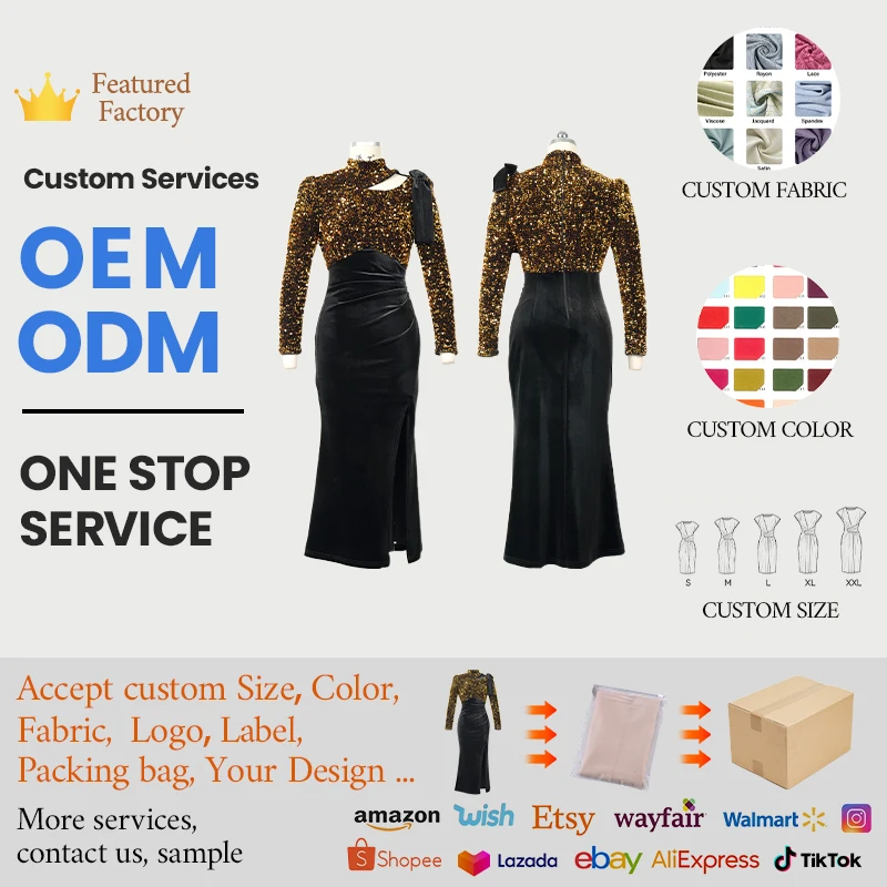ZYHT 51523 Glamorous Black & Gold Sequin Midi Dress with Mock Neck Long Sleeves Velvet Bodycon Dress with High Side Slit Dress