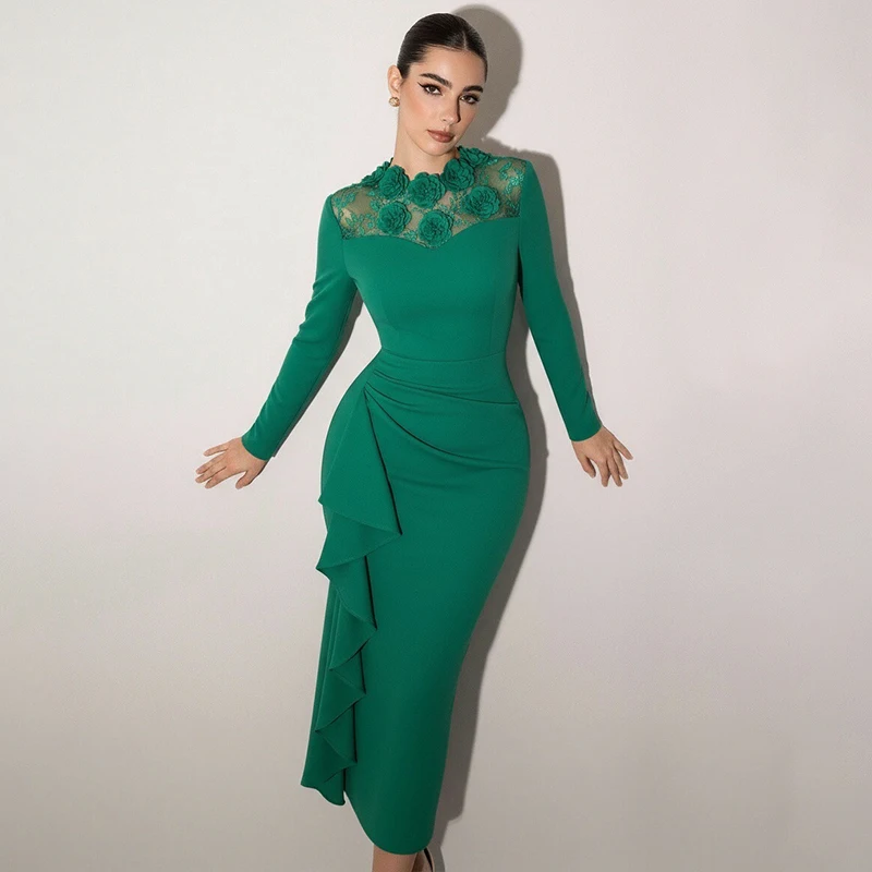 ZYHT 73944 3D Flower Lace Patchwork Asymmetric Bodycon Long Sleeves Spring Autumn Green Knee Length Women Casual Dress