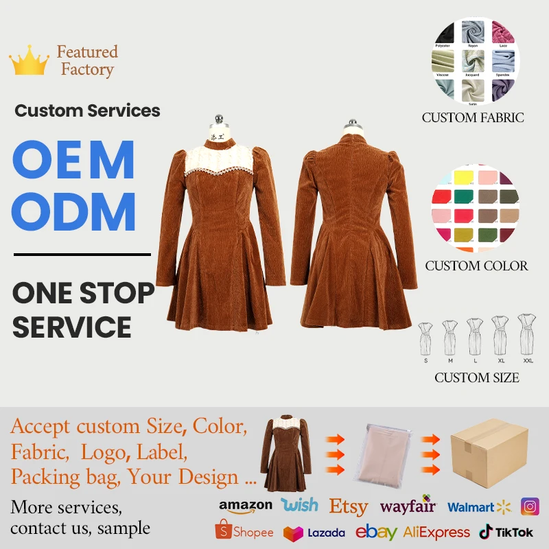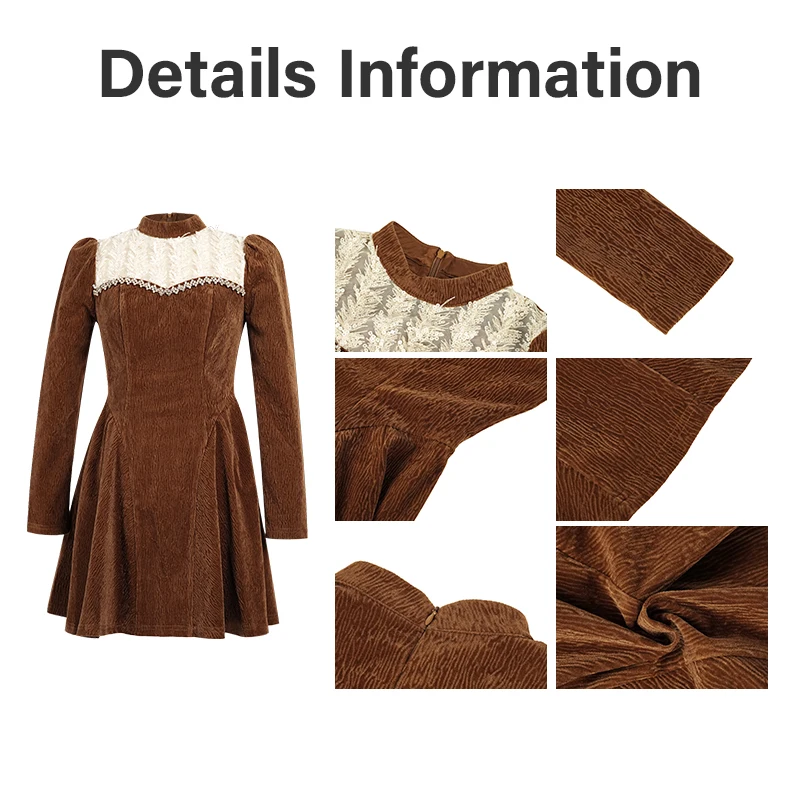 ZYHT 21916 Vintage Style Dress Brown Mini Dress with White Lace High Neck & Long Puff Sleeves Dresses