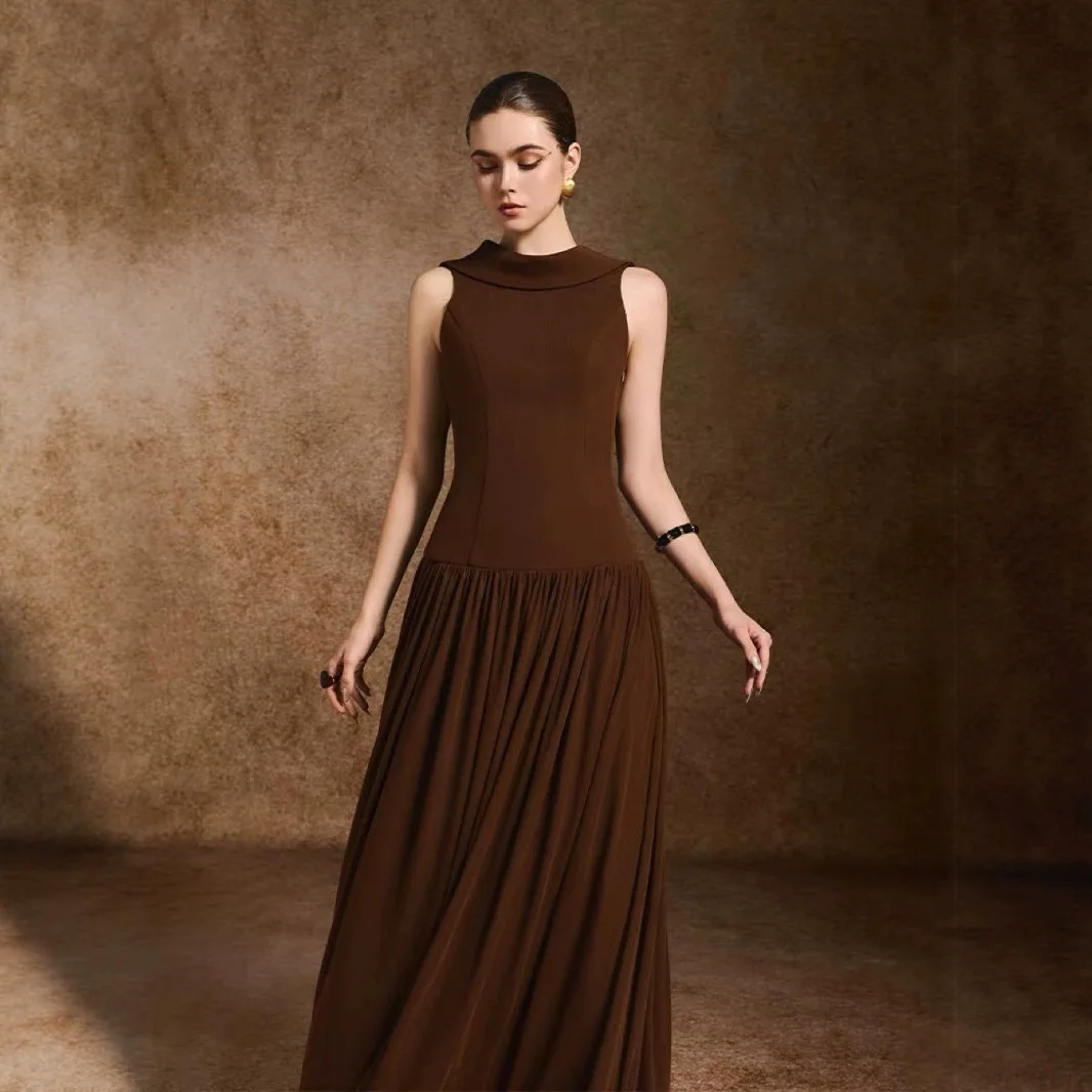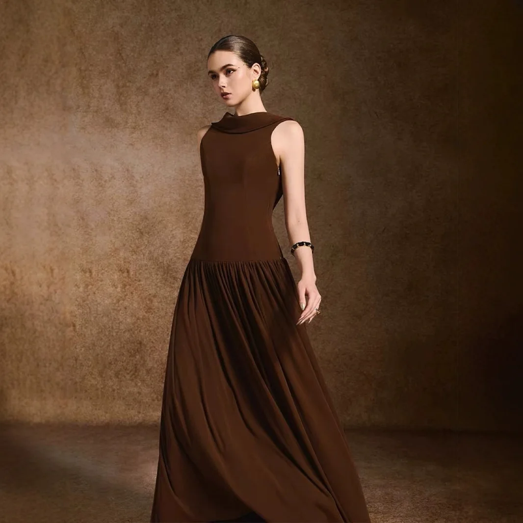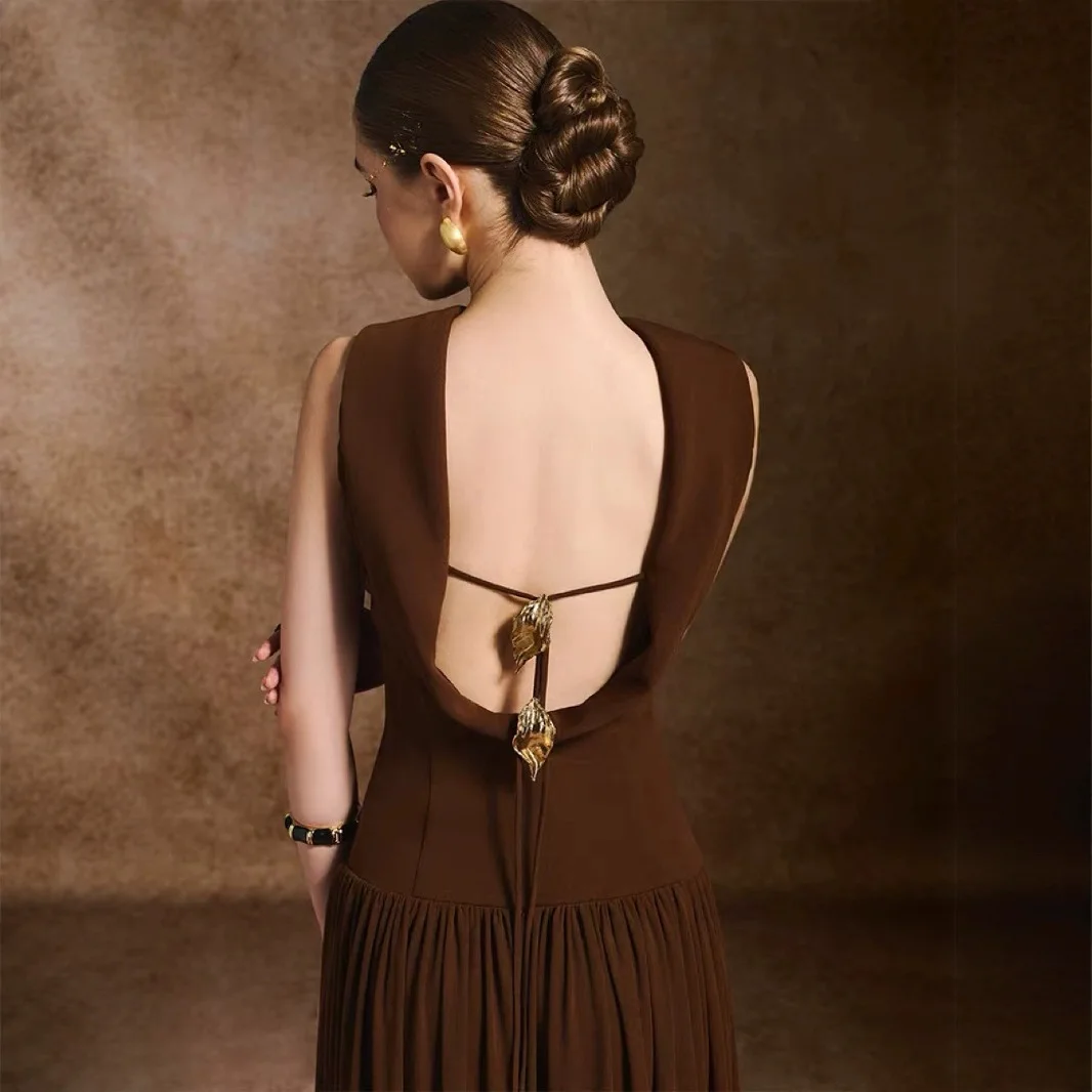 ZYHT 70133 Summer Women Boutique Solid Brown Backless Maxi Elegant Dresses Sexy Sleeveless Pleated Long Evening Party Dress