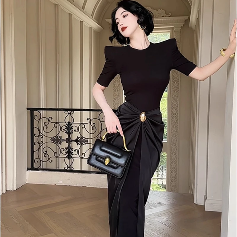ZYHT 73929 OEM ODM Customization Factory Knitted Satin Short Sleeve Drape Pleated Metal Decoration Pencil Elegant Dress
