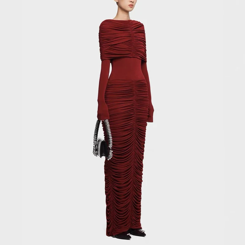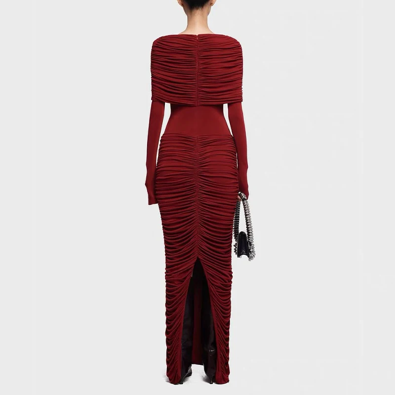 ZYHT 70126 Ladies Winter Cape Maxi Bodycon Burgundy Dresses for Women Long Sleeve Elegant Pleated Modest Chic Evening Dress