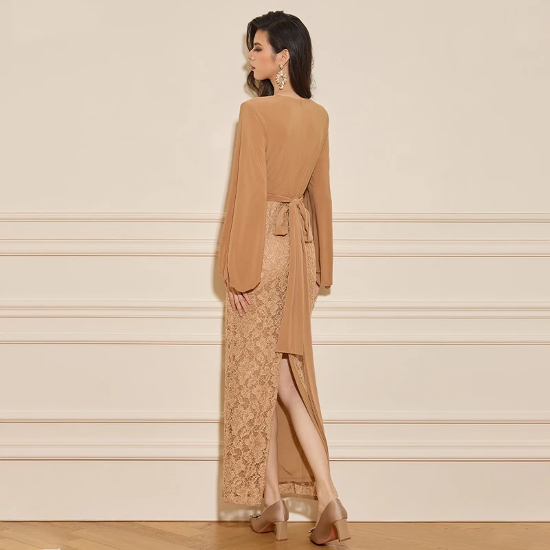 ZYHT 73926 Long Ruffle Sleeve V Neck Chiffon Top Lace Skirt Elegant Strap Women Lady Light Brown Casual Dress