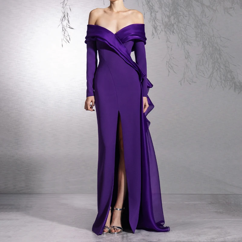 ZYHT 73470 Custom Made Purple Off-Shoulder Long Sleeve Satin Split Maxi Ruffles Chic Ladies Formal Evening Gown Dress Elegant