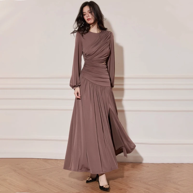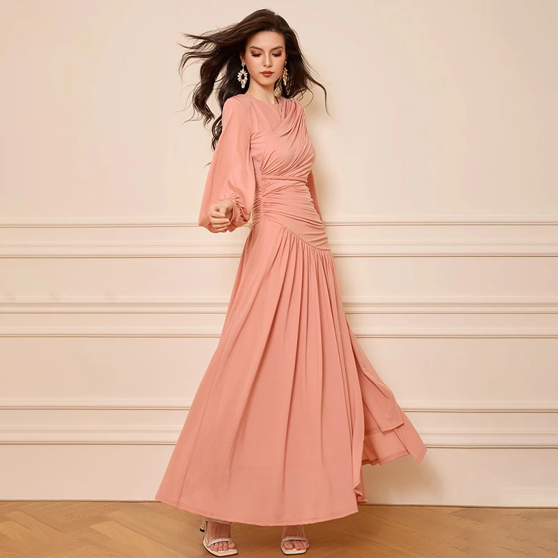 ZYHT 73919 Pleated Princess Style Casual Formal Plain Dyed Dress for Spring Summer 2025 Long Puffed Sleeves Slim Fit
