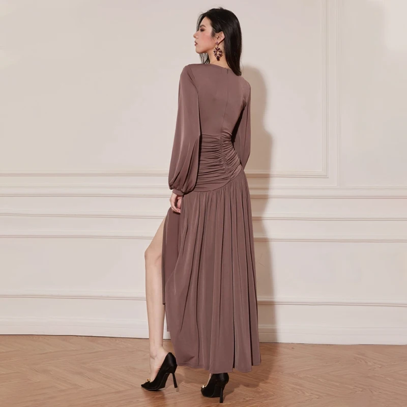ZYHT 73907 Custom Design Long Sleeve High Neck Fashion Pleated Crystal Beads Ruched Knot High Slit Sexy Luxury Evening Dress