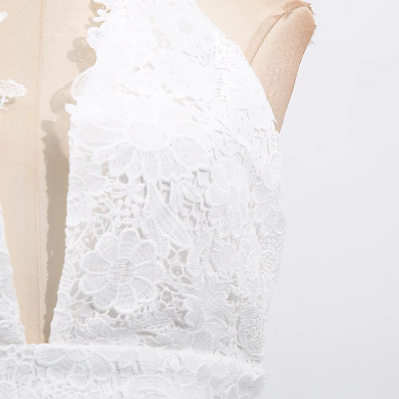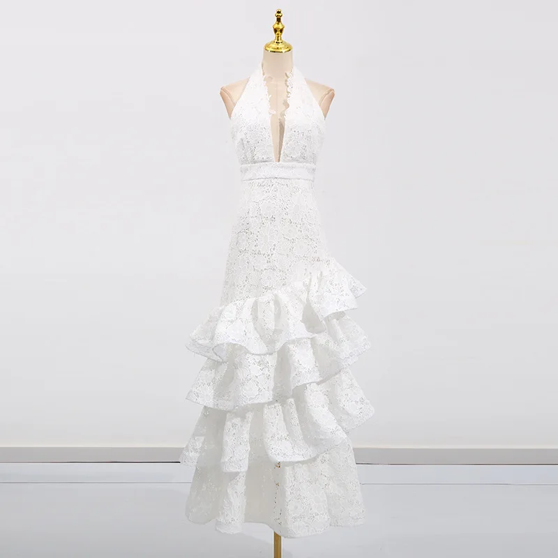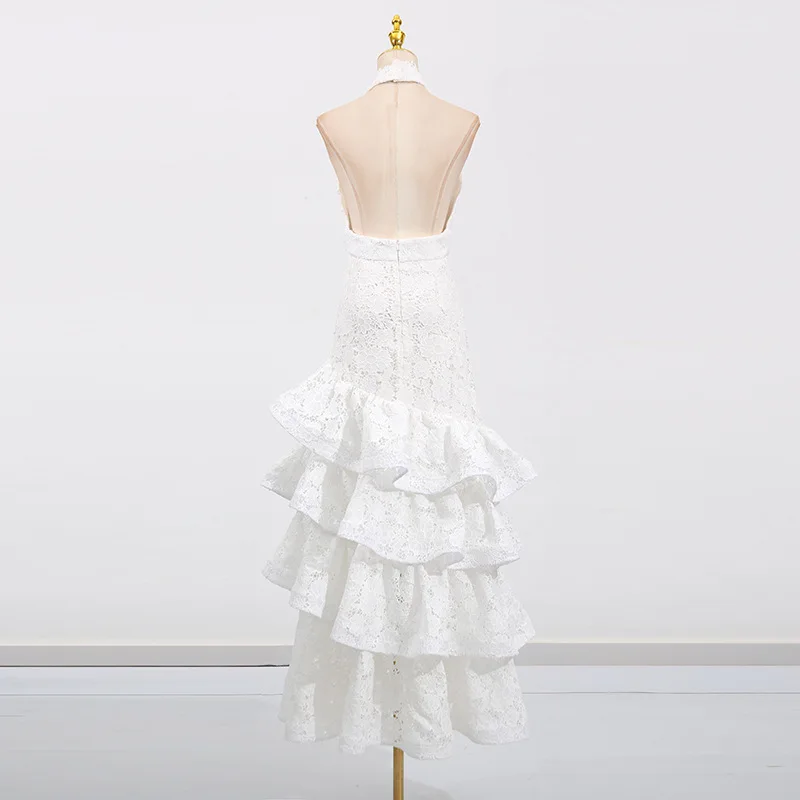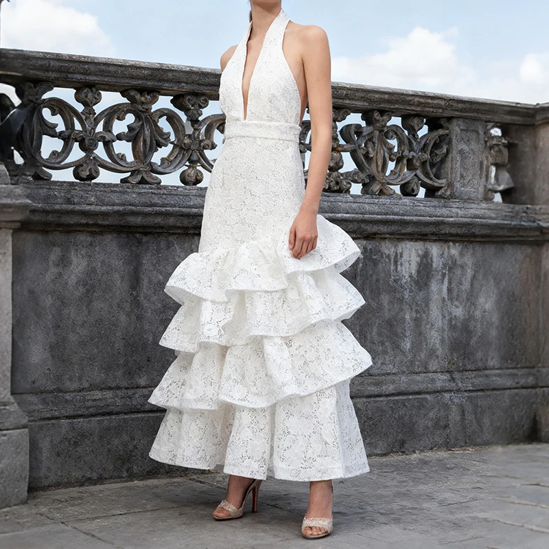 ZYHT 70121 Summer Elegant Chic Layered Cake Ruffle Maxi Long Lace Halter V Neck Sexy Sleeveless Backless White Dress for Women