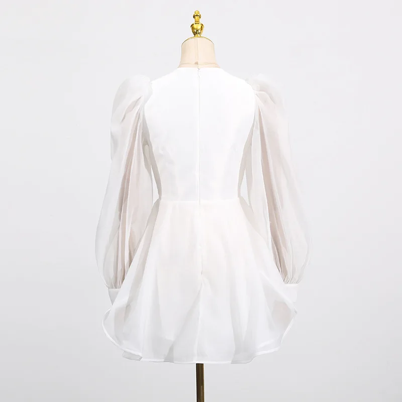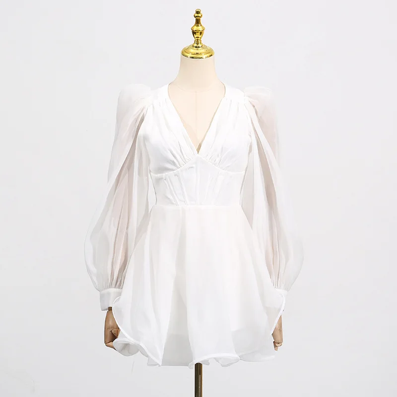 ZYHT 70119 Elegant V Neck Short Sexy A-line Dress Nightclub Party Long Sleeve Mini Autumn Dress Vestidos White Dress for Women