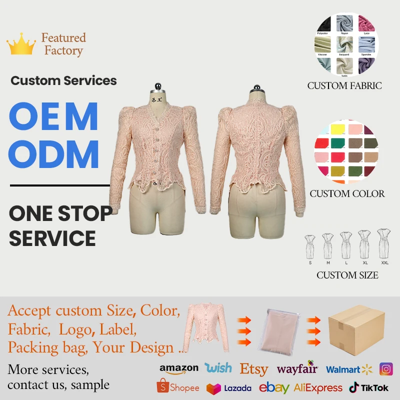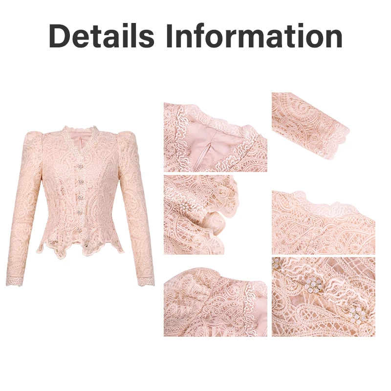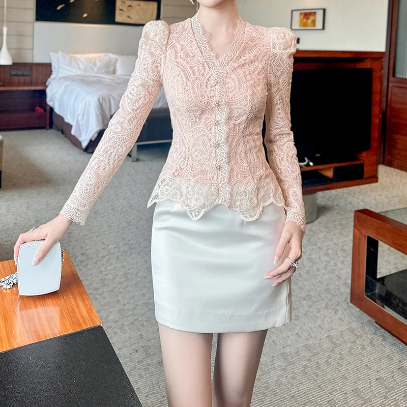 ZYHT 11680 Blouse Women Tops Elegant Pink Lace Blazer with V-Neck Puff Sleeves Long Sleeve Jacket for Office