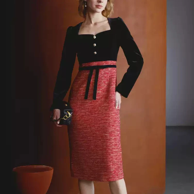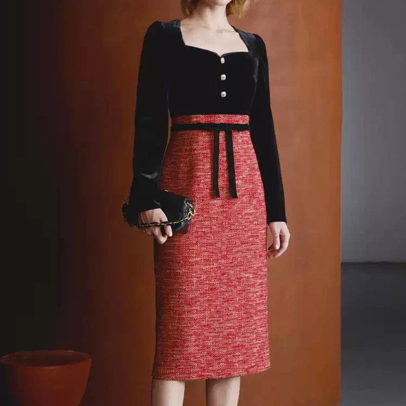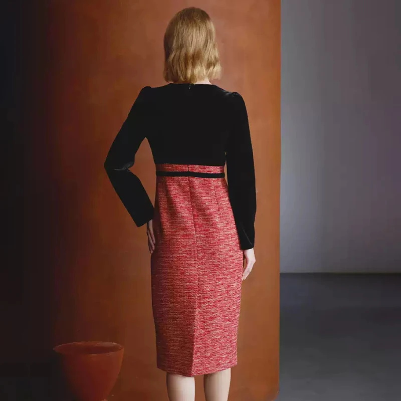 ZYHT 74079 Elegant Winter Black Velvet Red Tweed Sweetheart Neck Dress Fashionable Women Lady Girl Light Party Dress
