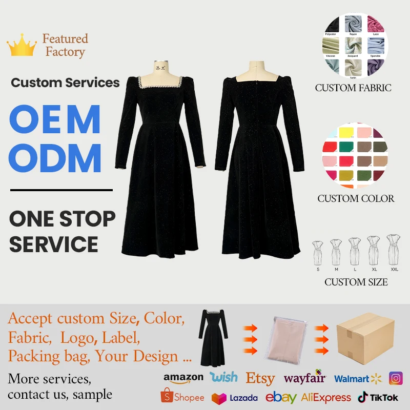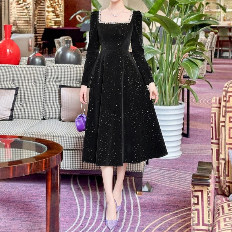 ZYHT 9969 Black Velvet Midi Dress with Crystal Trimmed Square Neck Long Sleeves Sparkle Glitter Flared Silhouette Long Dress