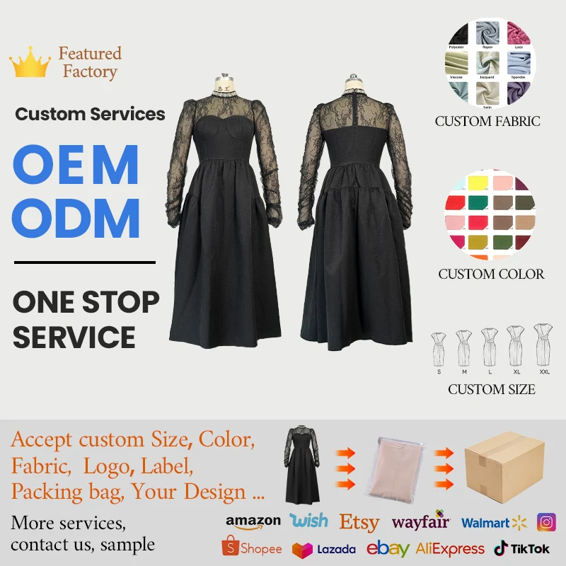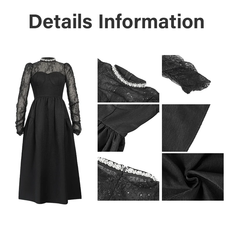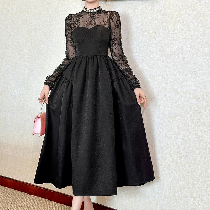 ZYHT 9965 Dresses Women Lady Elegant Black Lace Mock Neck Midi Dress with Long Sleeve Sweetheart Flared Dress