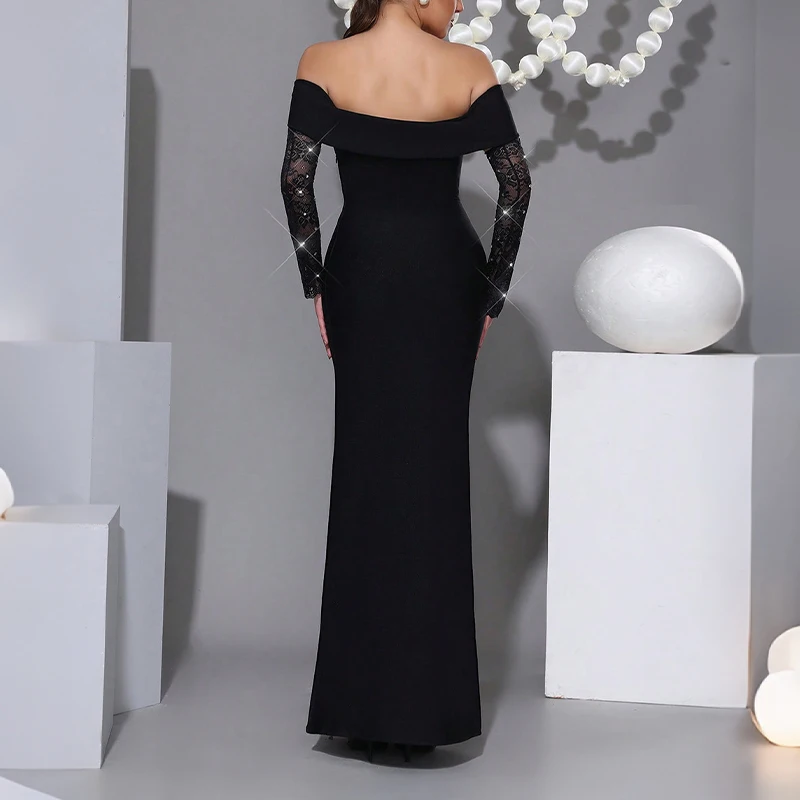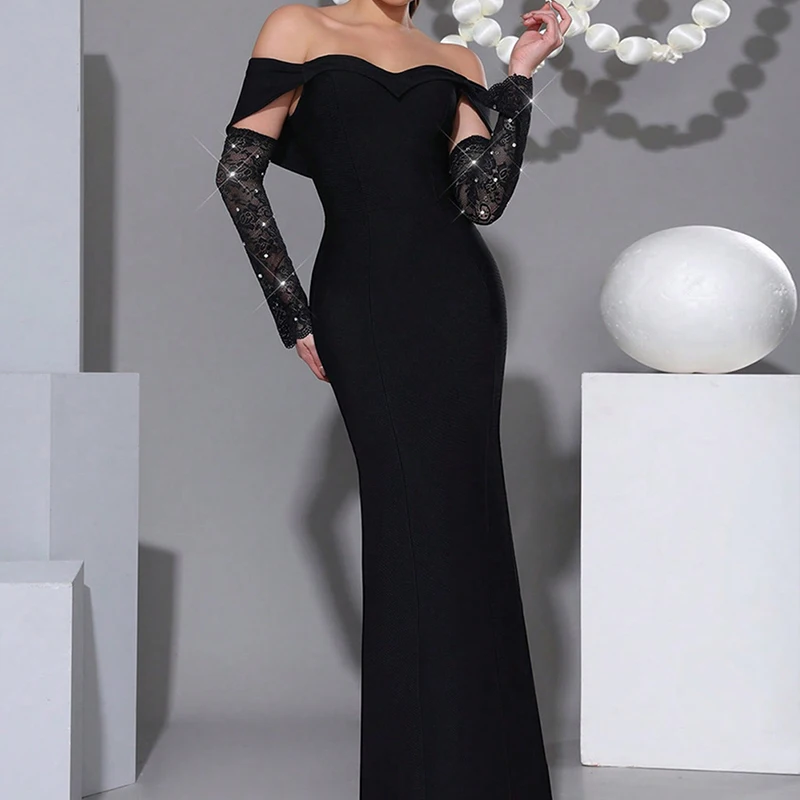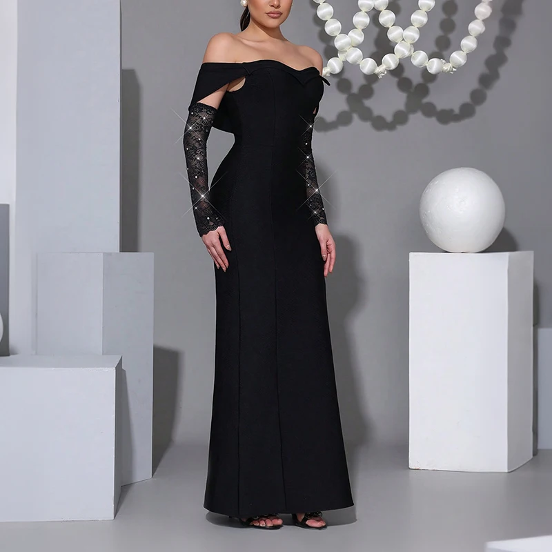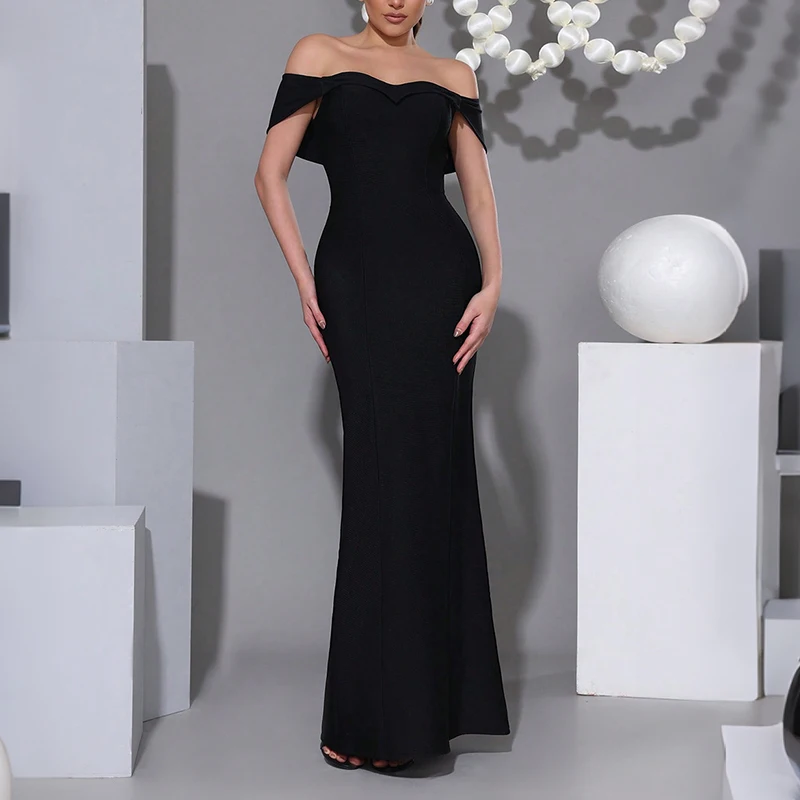 ZYHT 70104 Women Elegant Dresses Wholesale Custom Wrap Hip Off Shoulder Gown Female Black Evening Party Long Dress with Gloves