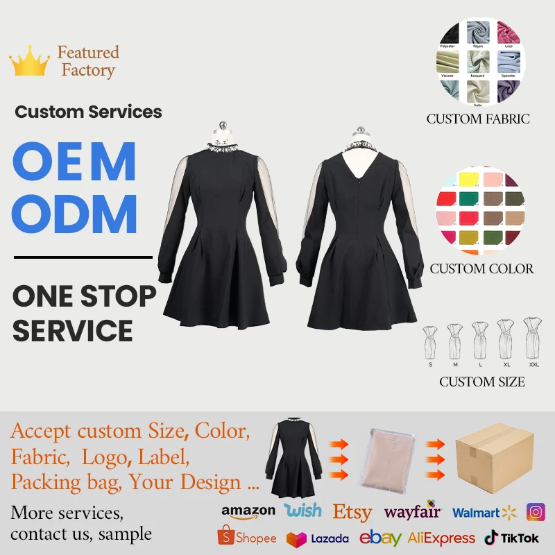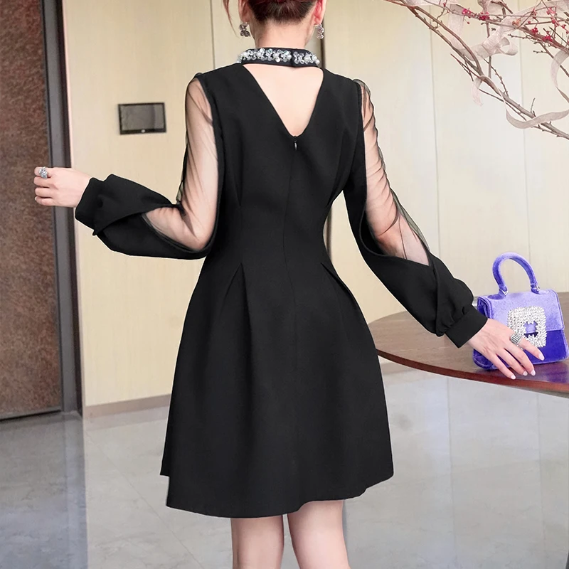 ZYHT 9132 Black Mini Dress with Sheer Mesh Sleeves Crystal-Embellished Neckline Dresses for Ladies Casual Dresses