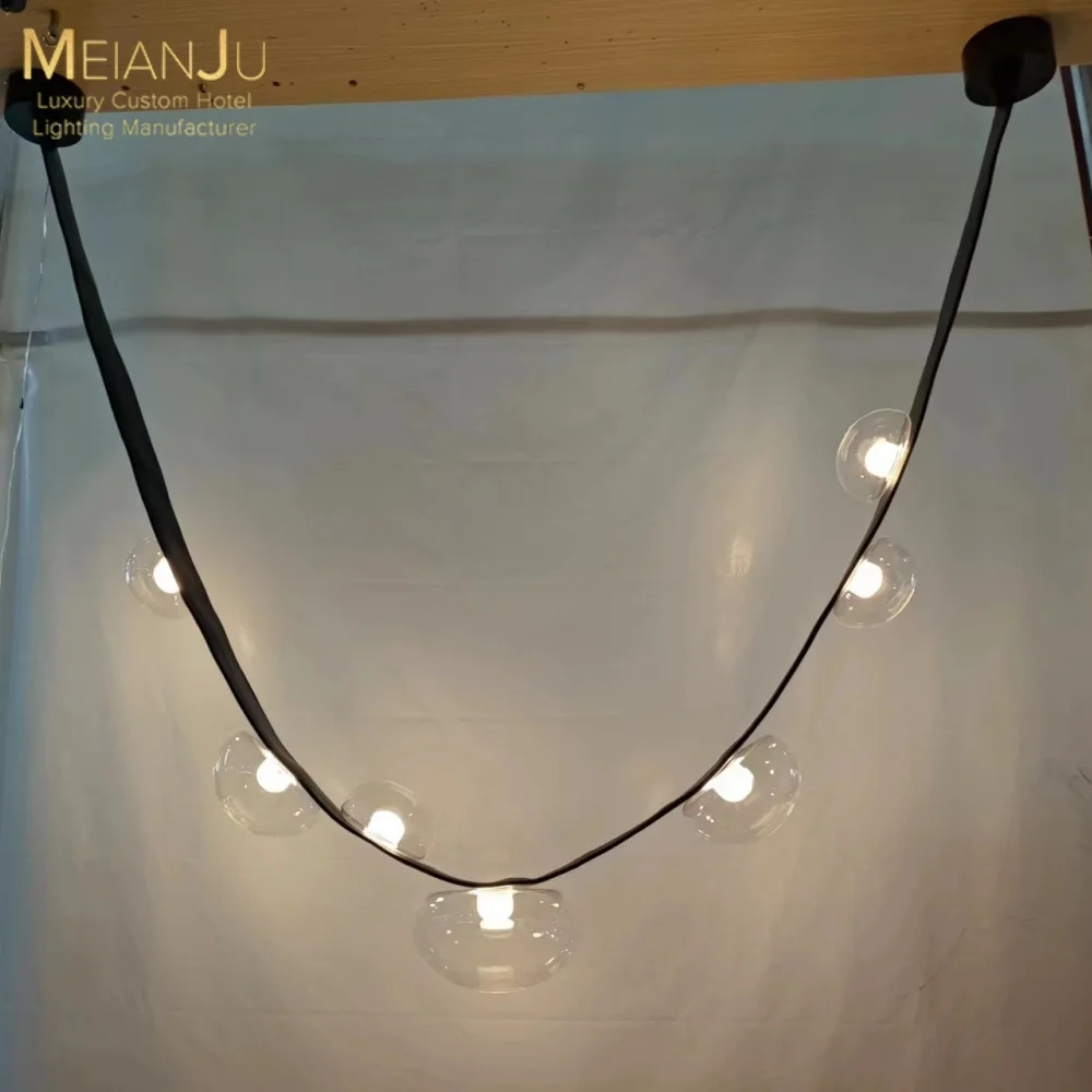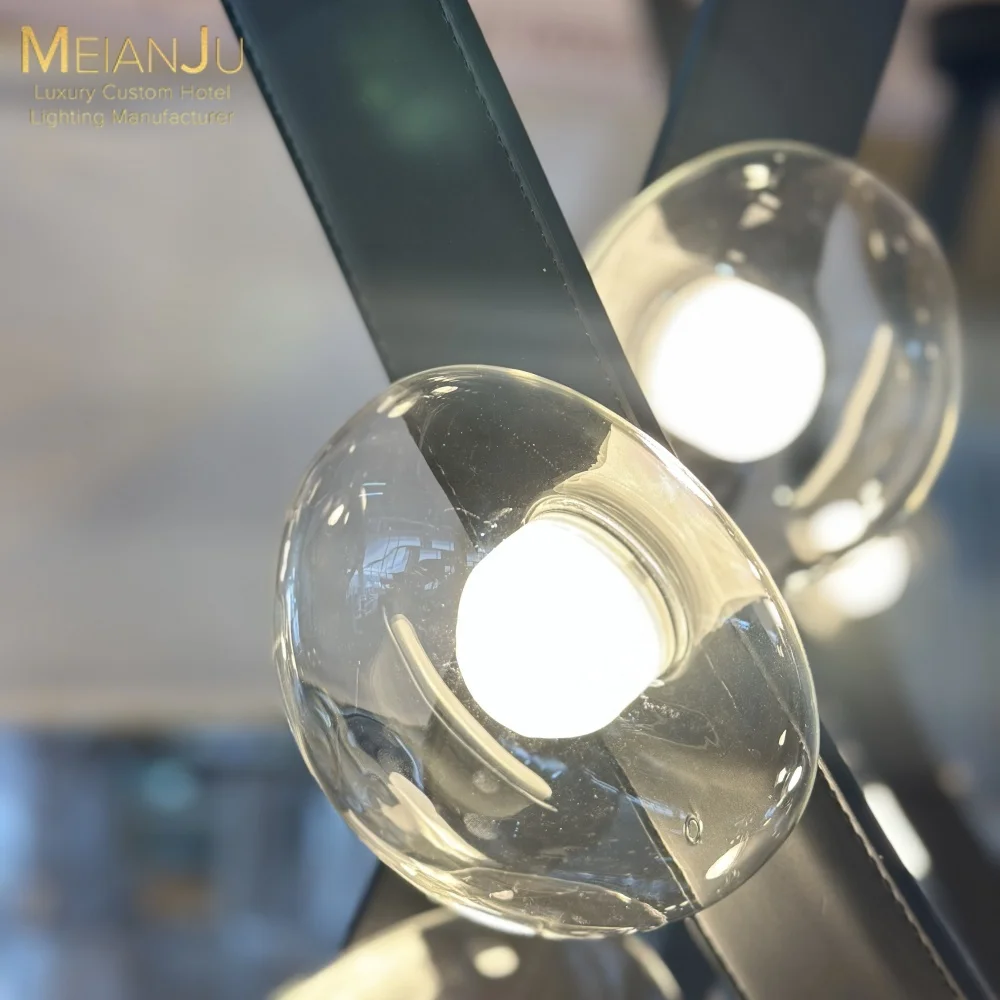 Art Nouveau Style Home Theater Leather Chandelier Lamp with Frosted Pebble Glass and Stainless Steel Body for Hotels