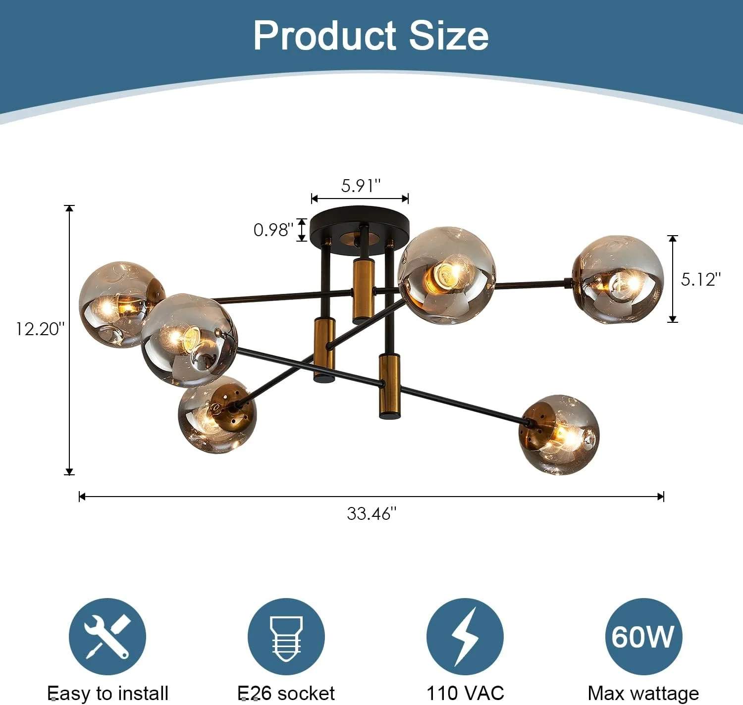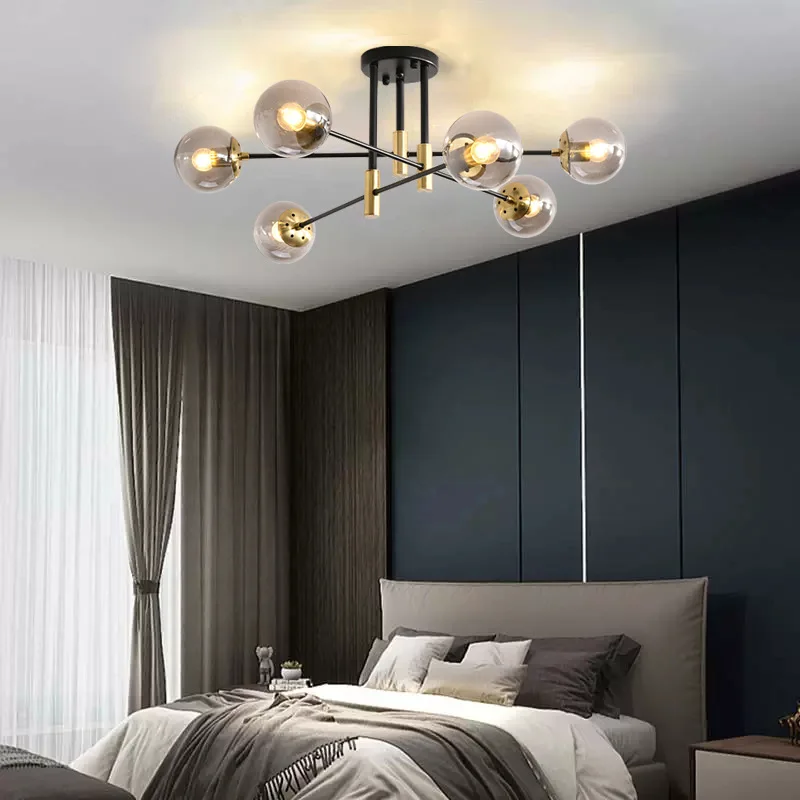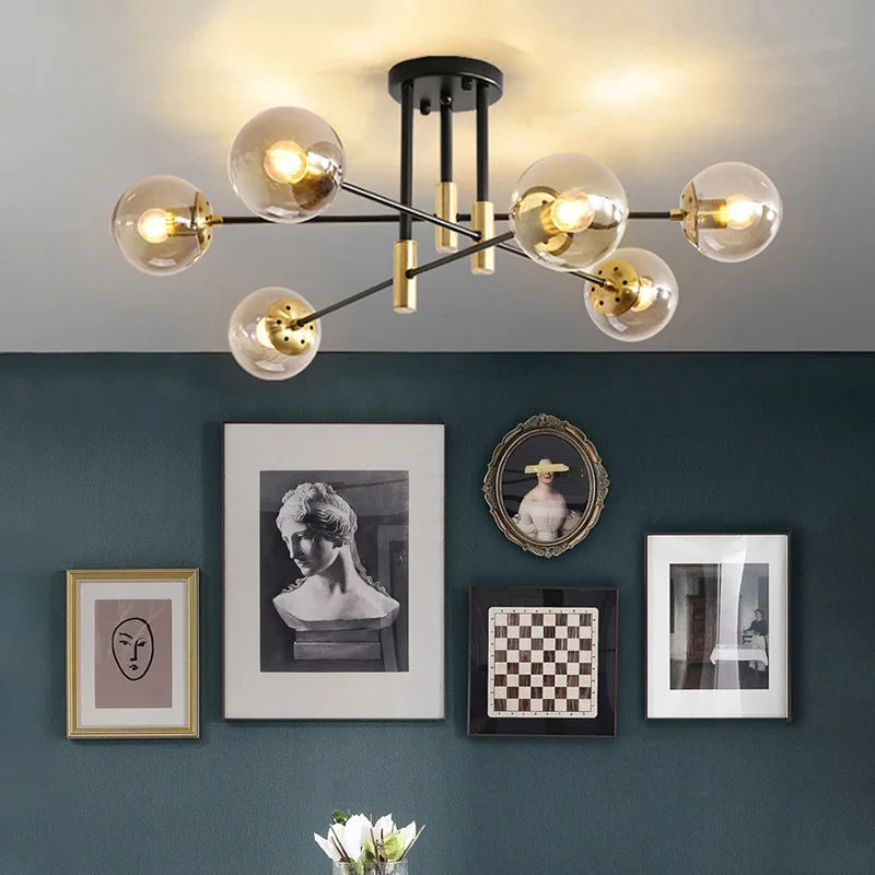JACKSUN Modern Retro Sputnik Chandelier 6-Lamp Glass Globe Matte Black Gold Finish for Living Room Kitchen Farmhouse Style