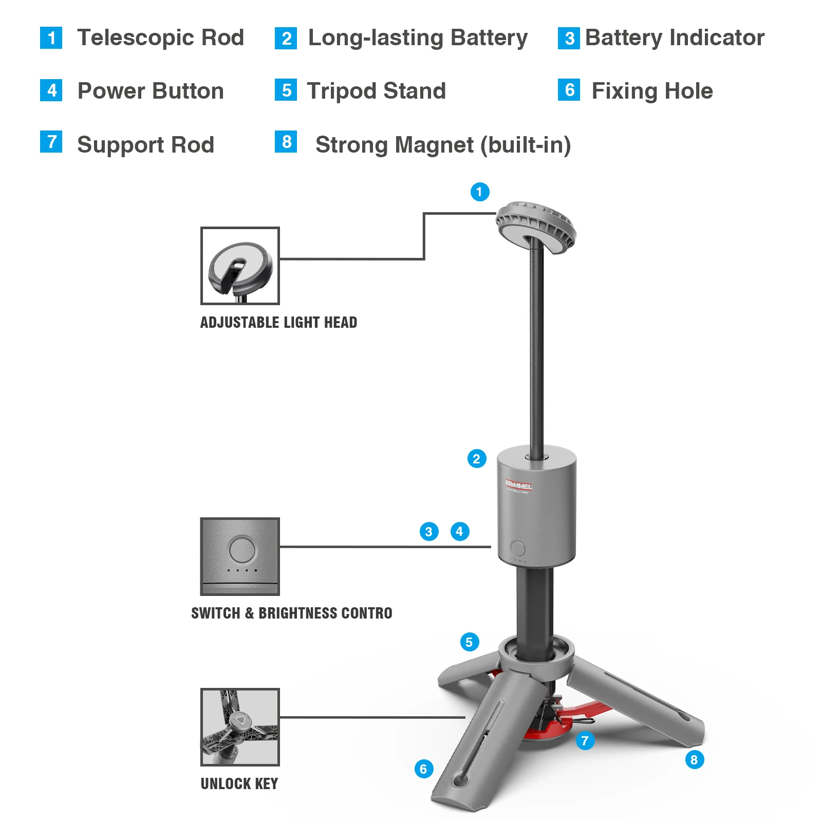 Vertak Hiking BBQ Rechargeable Emergency Collapsible Telescopic LED Working Lamp Lights Cordless Camping Light with Tripod