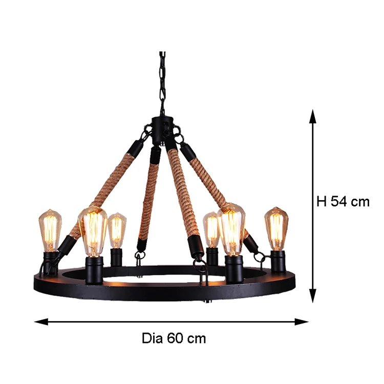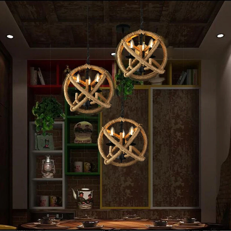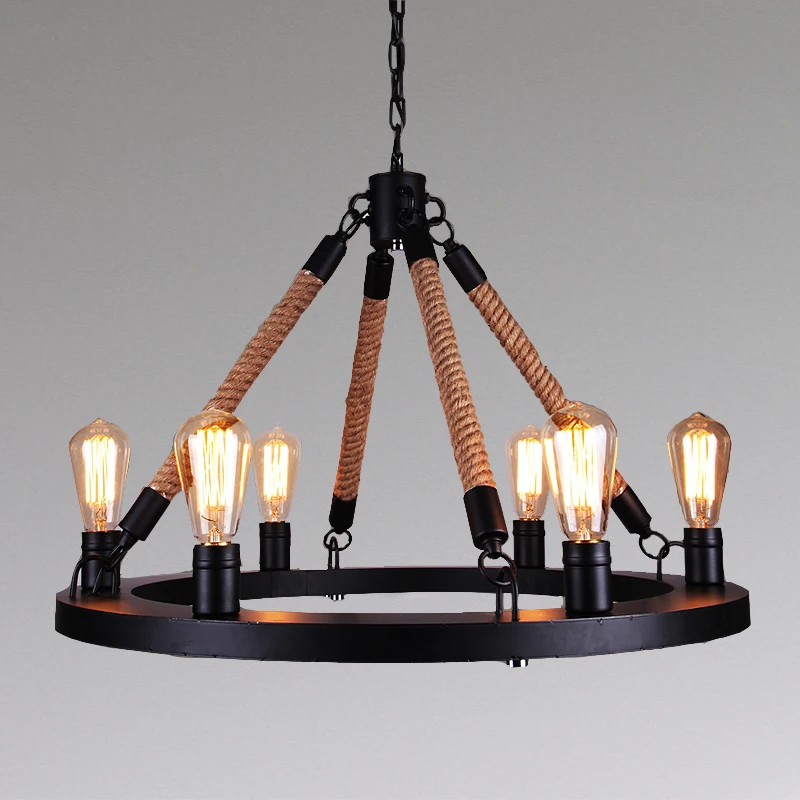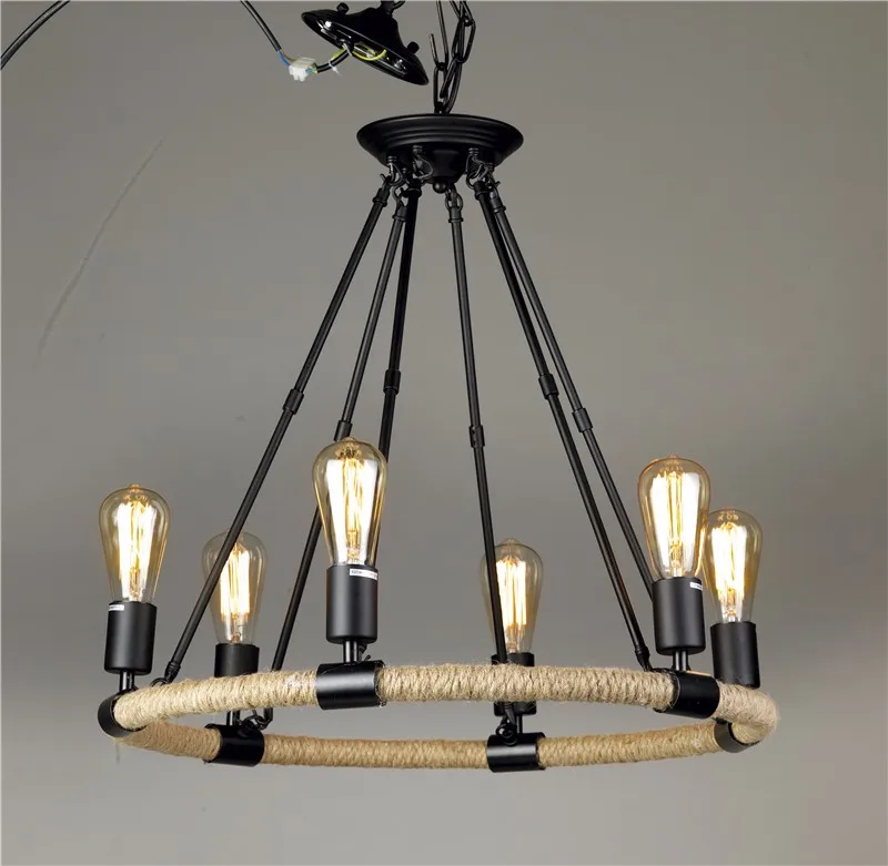 Vintage Industrial Lighting Retro Hemp Rope 6 Lights Vintage Wrought Iron Loft Restaurant Pendant Light