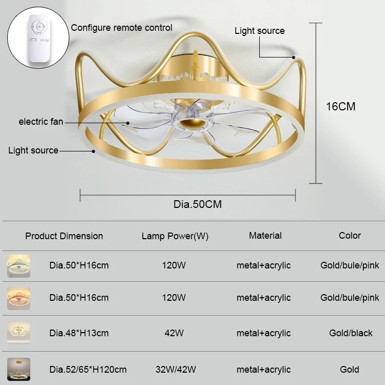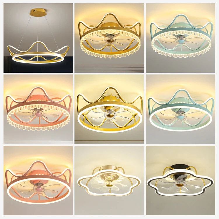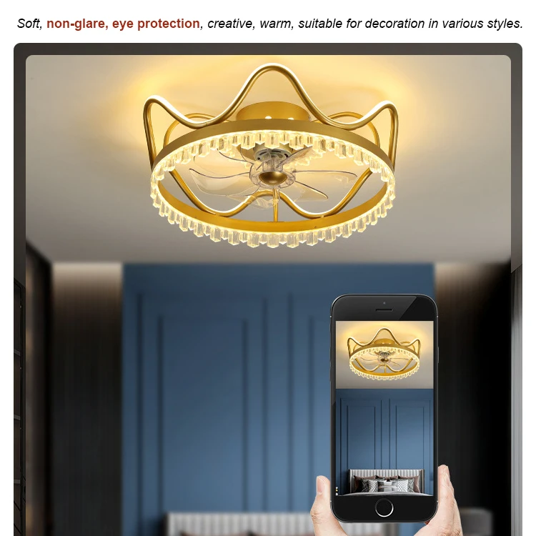 Nordic Gold Modern Luxury Crown Silent Fan Light Fancy Hidden Transparent Blade Crystal Flush Mount Ceiling Fan With LED Light