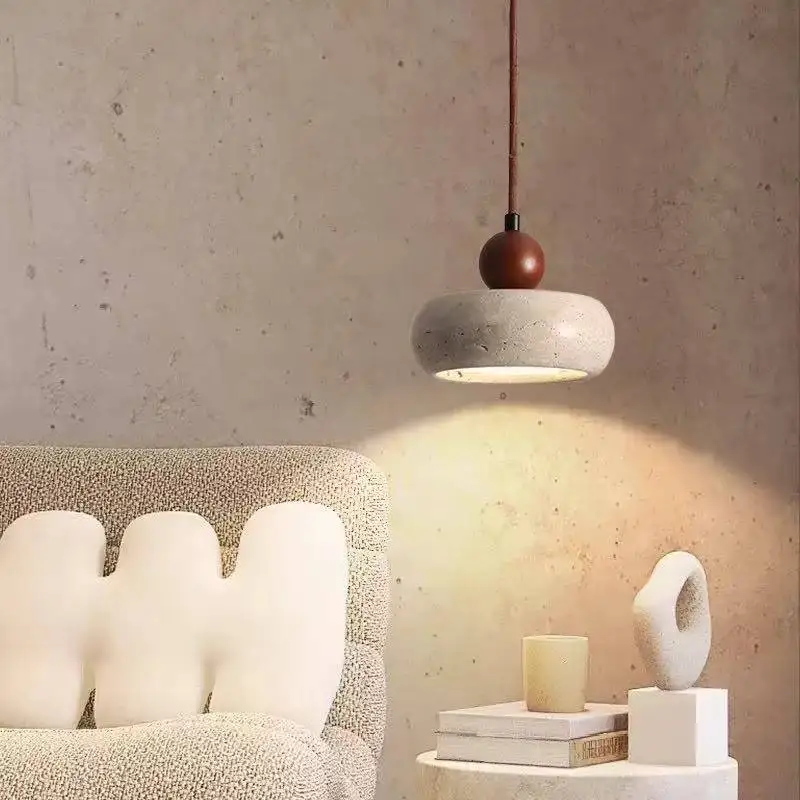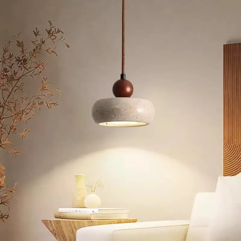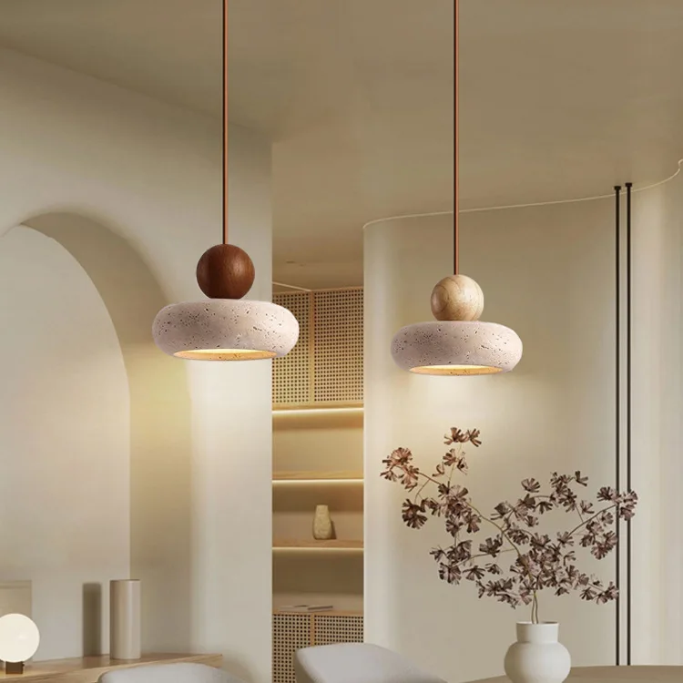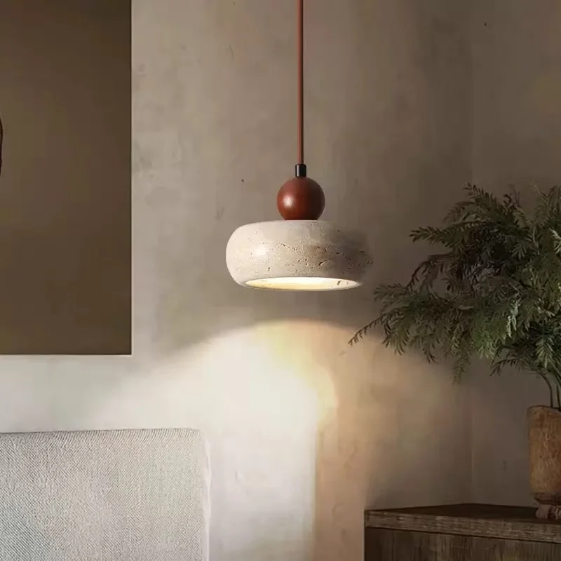 Retro Wabi-Sabi Style Natural Yellow Travertine Small Chandelier Solid Wood Ball Lamp Stone for B&B Bedroom Bedside Restaurant