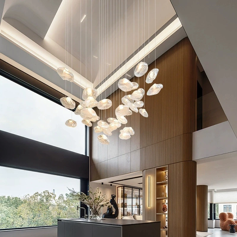Designer Glass Cloud Long Pendant Light Gold Finish Adjustable Height LED for Hotel Duplex Staircase Double Height Apartment