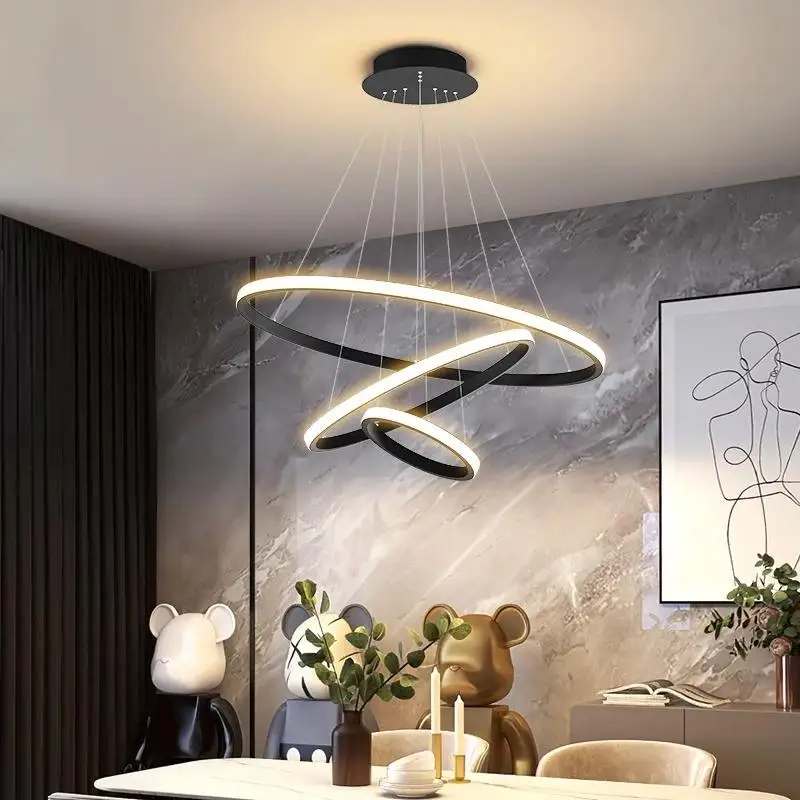 Round Pendant Light Modern Black Gold Hanging Light Adjustable 3 Circle Ring Acrylic Chandelier