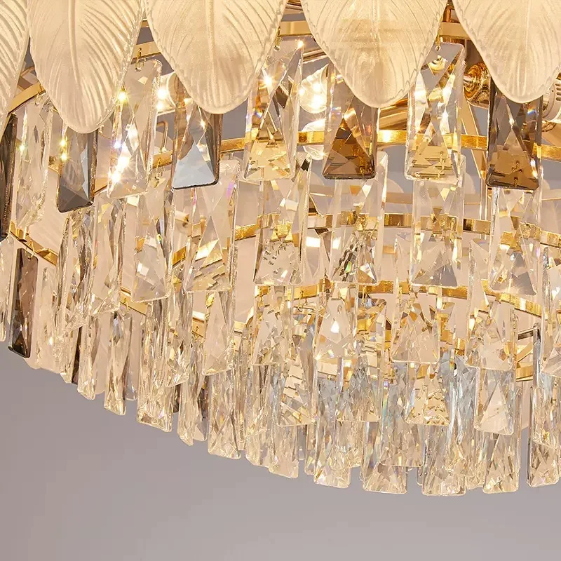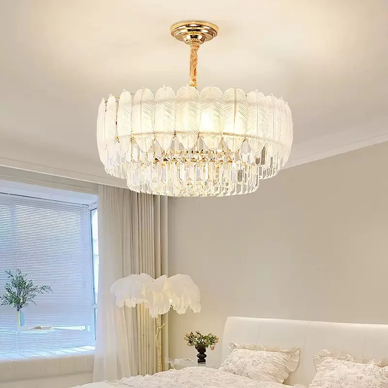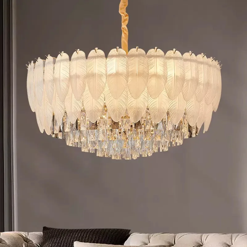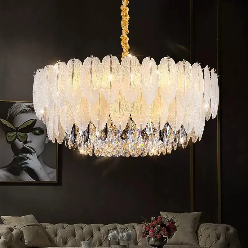 Modern French Elegant AC Pendant Lights Feather Crystal Chandeliers with Adjustable Height for Hotel Lobby Living Room Villa