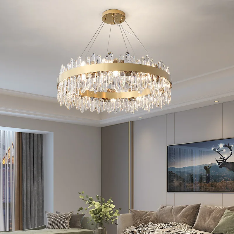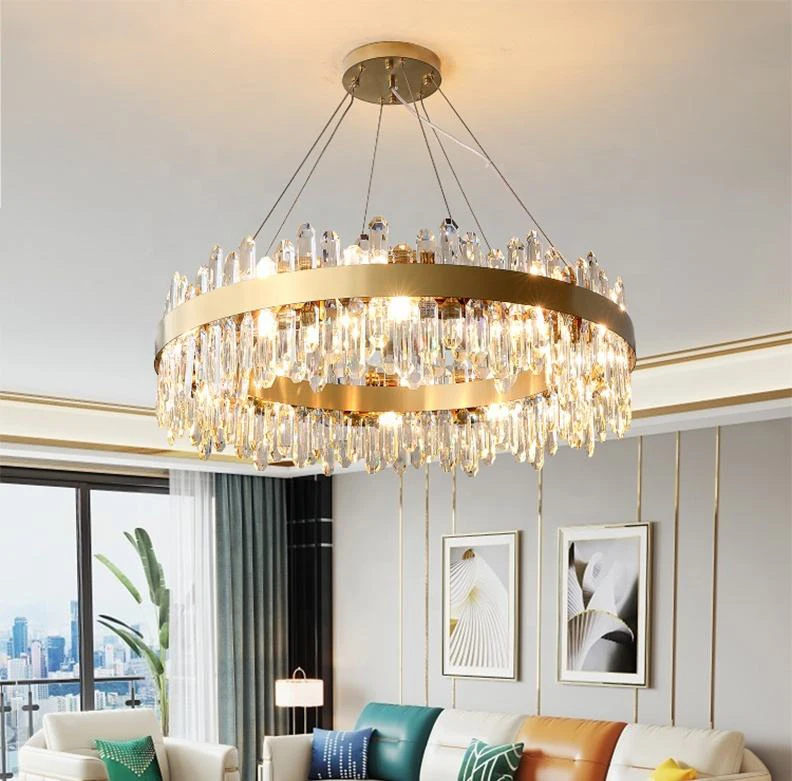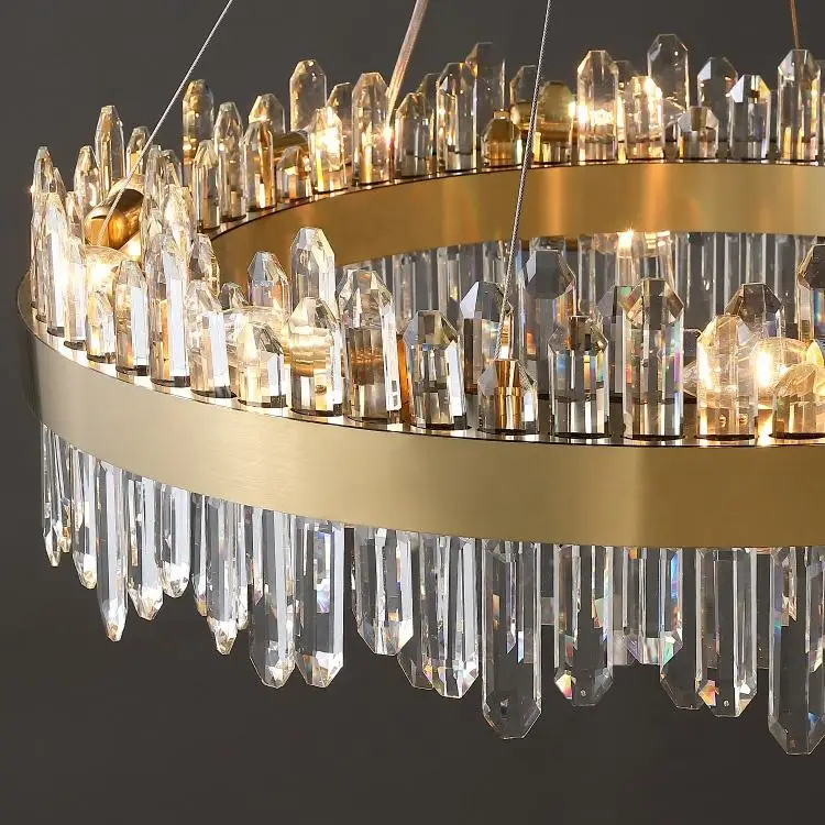 Gold Luxury Connector Rings Round Pendant Light Brushed Gold Crystal Chandelier for Living Room