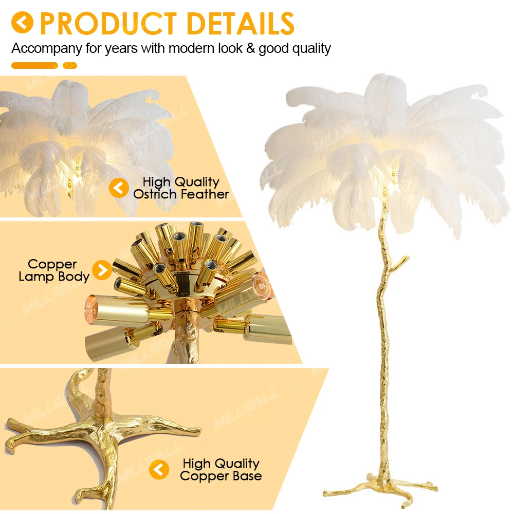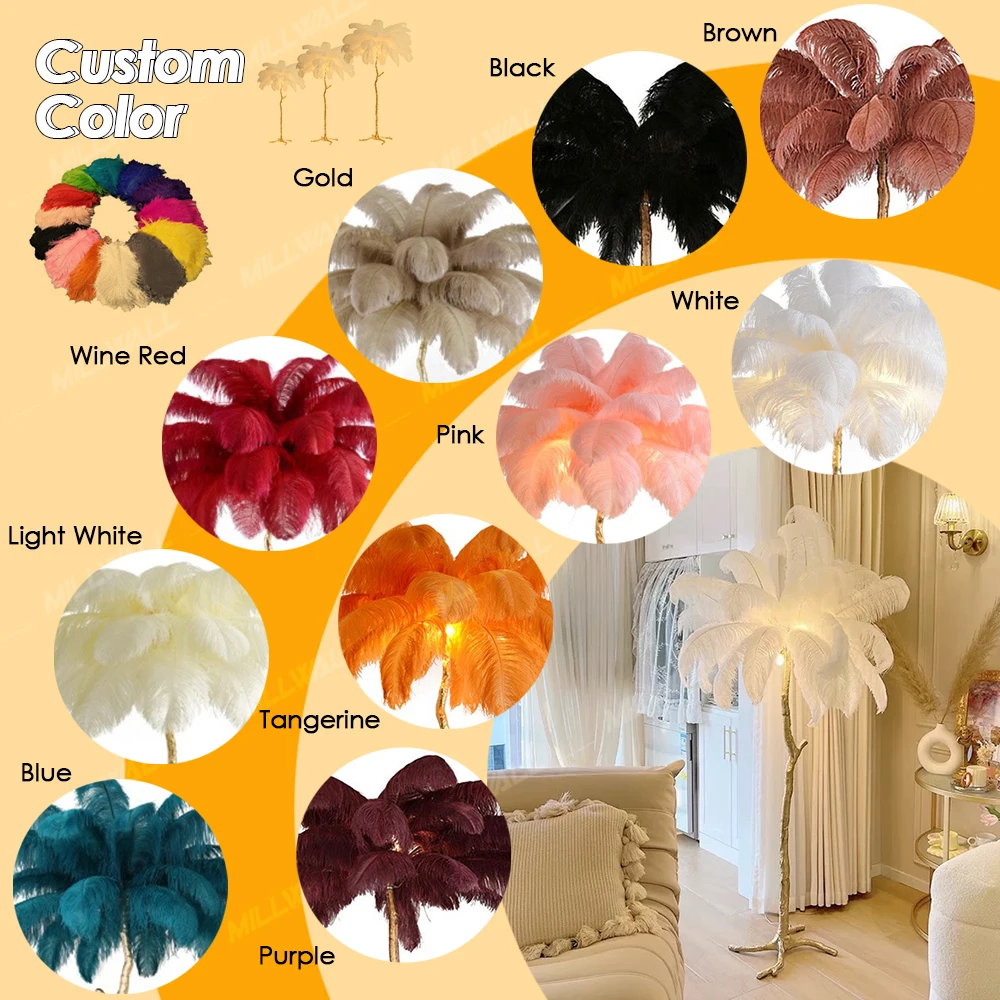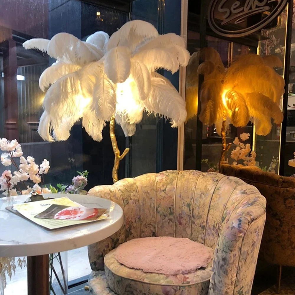Wholesale High Quality Low MOQ Copper Decoration Tree Ostrich Feather Standing Hotel Corner Decor Modern Led Feather Floor Lamp