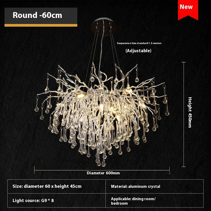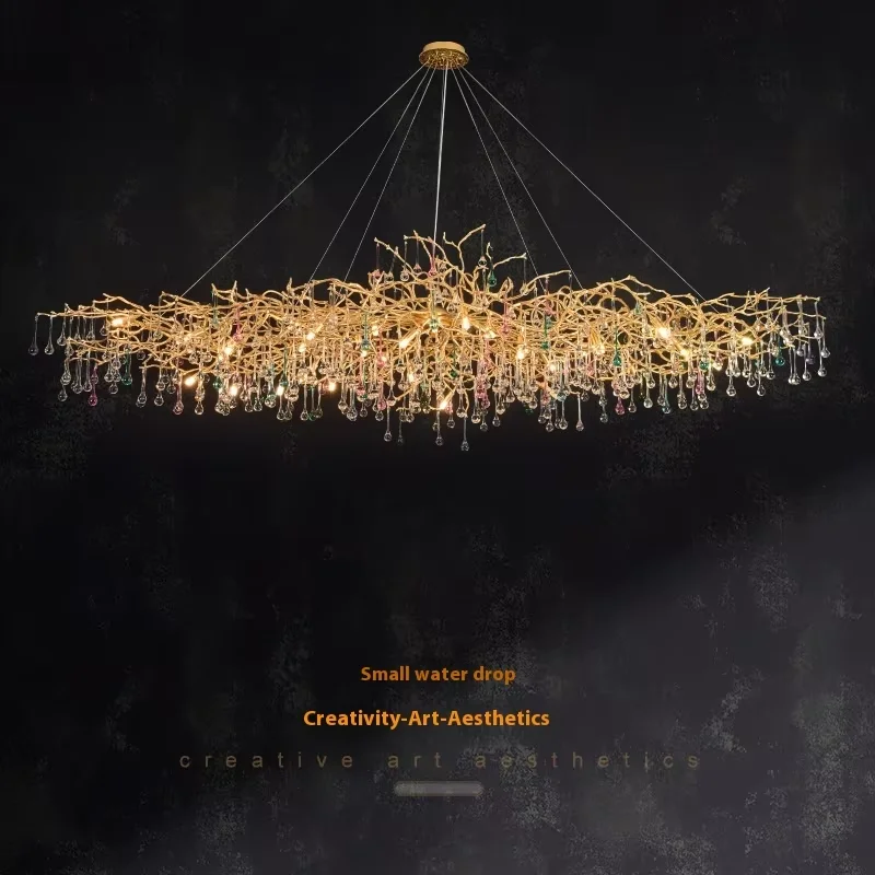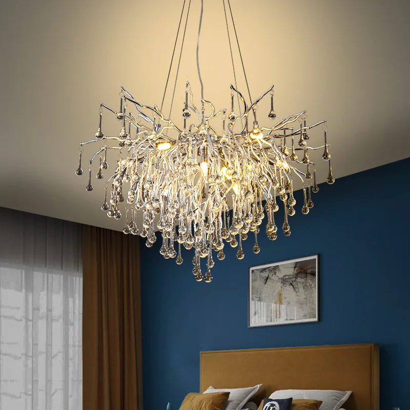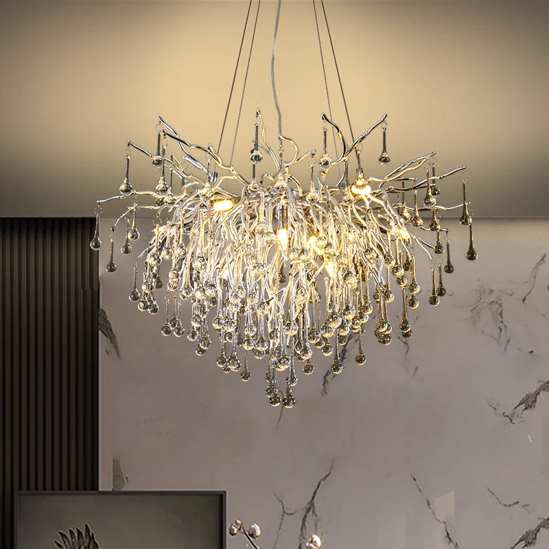 Light Luxury Crystal Chandelier for Living Room Creative Water Drop Branch Glass Art Middle E12 Commercial Dining Aluminum
