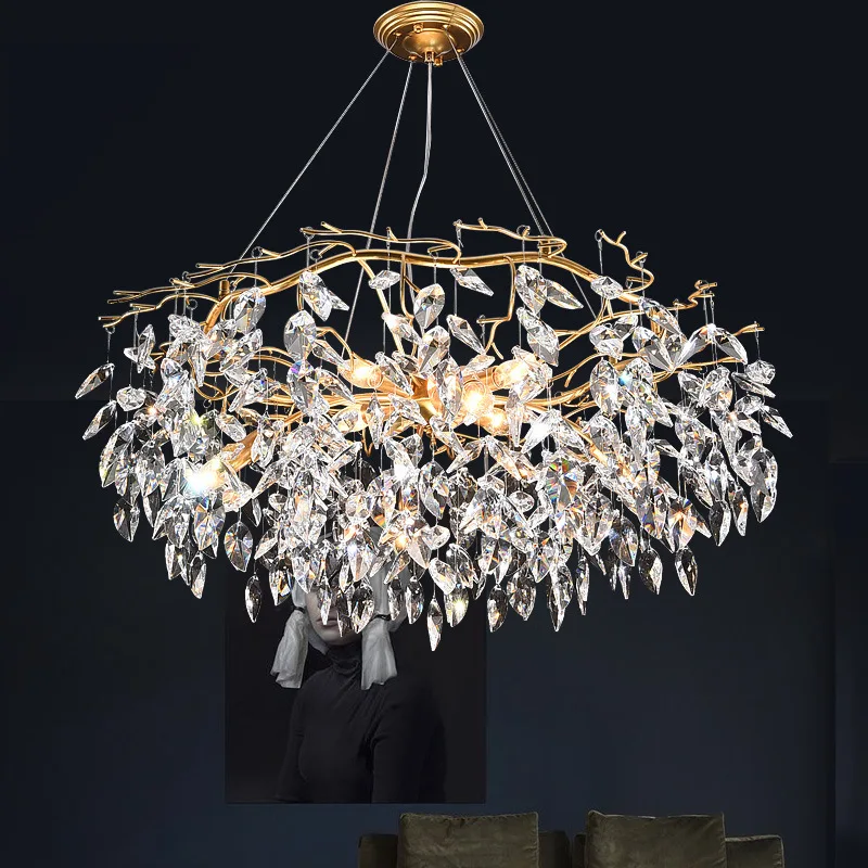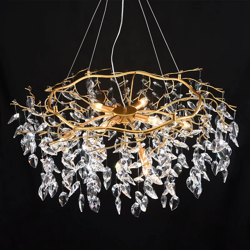 Home Decoration Gold Hanging Lamp Living Room Modern Art Led Raindrop Crystal Leaf Oval Chandelier