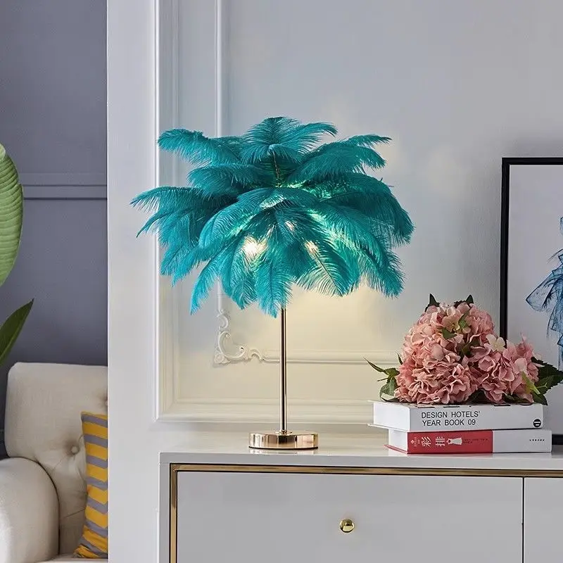 Romantic Decoration Feather Night Light Bedside Led Modern White Ostrich Feather Table Lamp With Desk