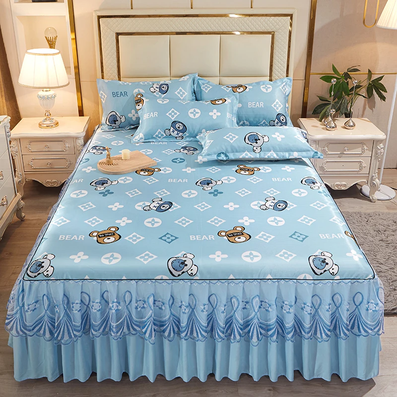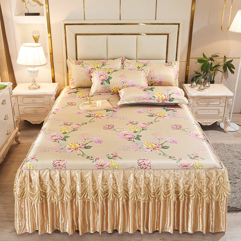 2026 Hot Selling New Comfortable Smooth Washable Polyester Printed Breathable Ice Silk Bed Skirt Set