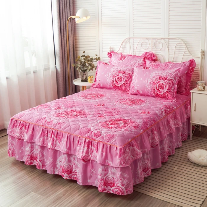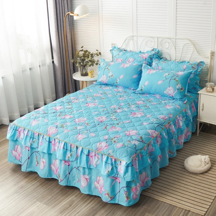 Hot Selling Double Layer Bedspread Floral Printed Bed Sheet Bilateral Bed Skirt + 2 Pair of Pillowcase Bedsheets