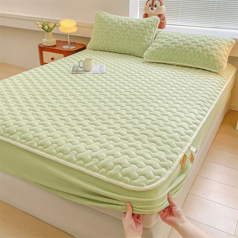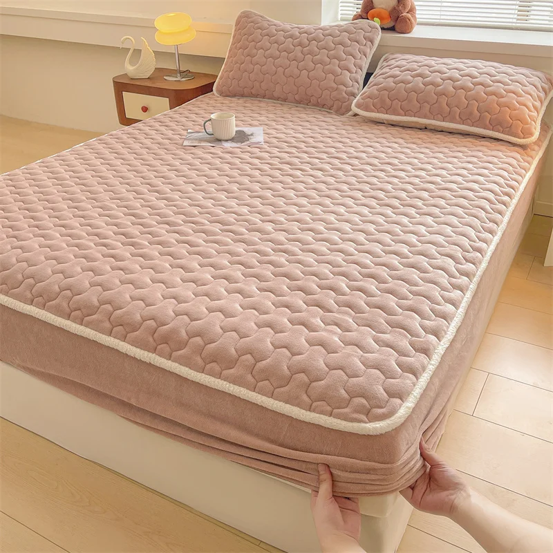 King-Size Warm Fluffy Fitted Bedsheet Velvet Bed Cover with Flannel Fleece Waterproof Polyester Mattress Protector for Hotels