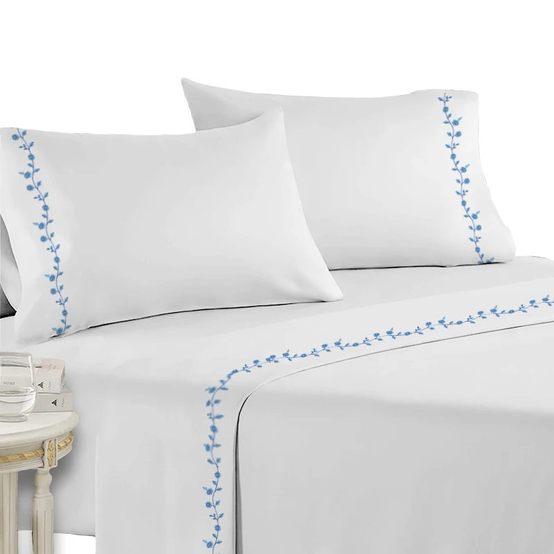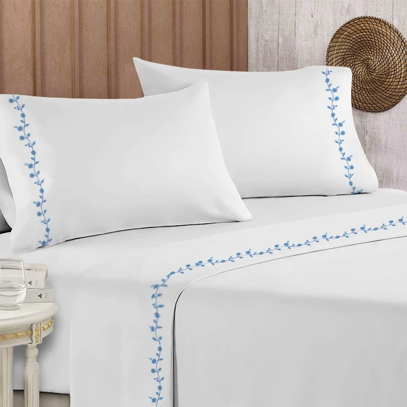 Home Luxury Embroidery Blue Flower Solid Cooling Wrinkle Free Bed Sheets 4 PCS