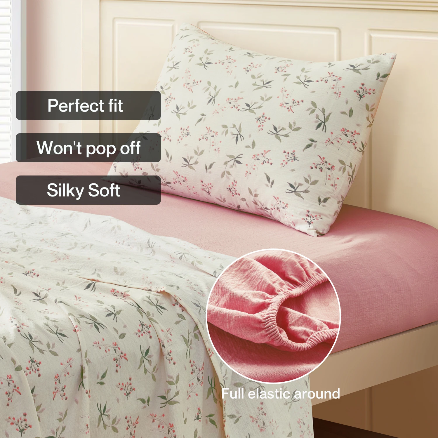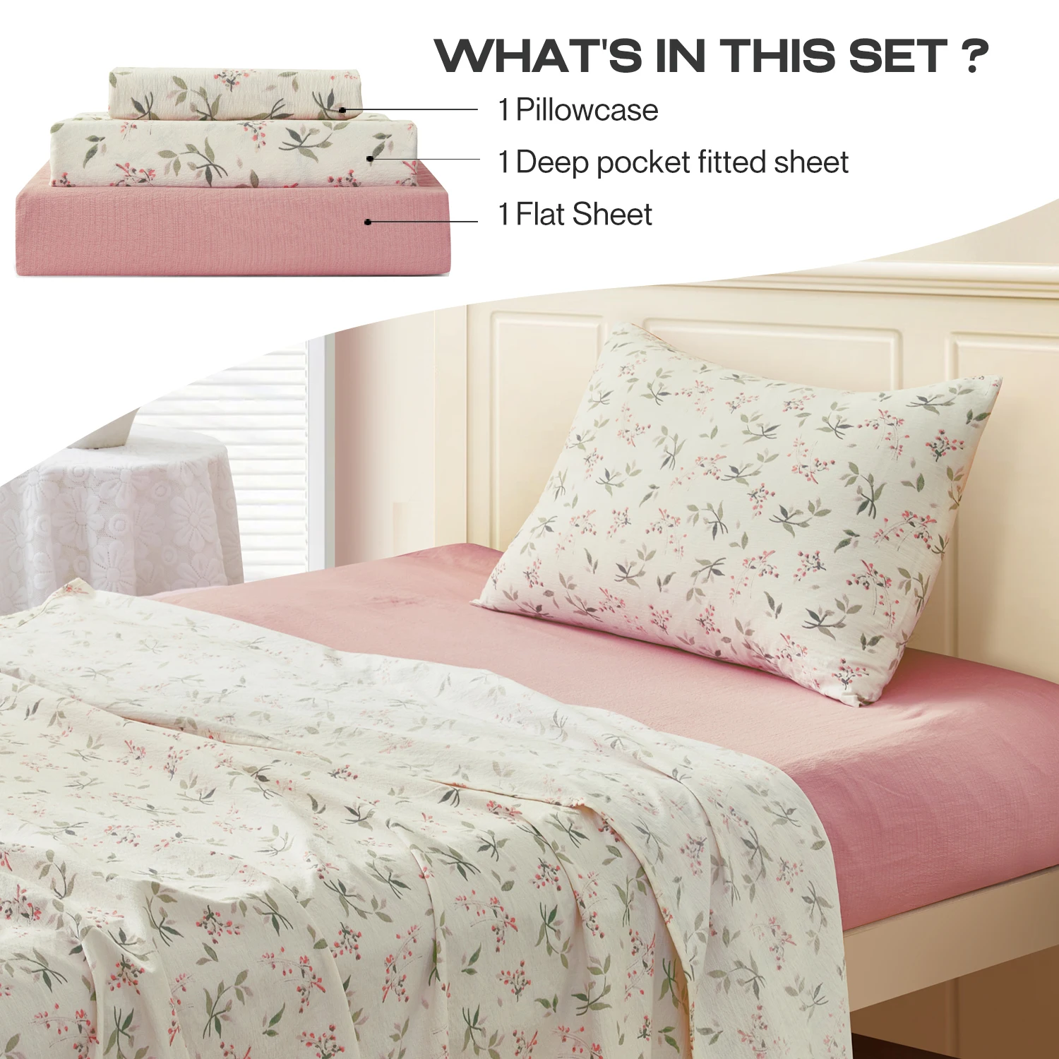 3 Piece Microfiber Twin Bed Sheet Set Printed Plant Pattern OEKO-TEX Certified Air-Permeable Bed Sheets Pillow Covers for Home